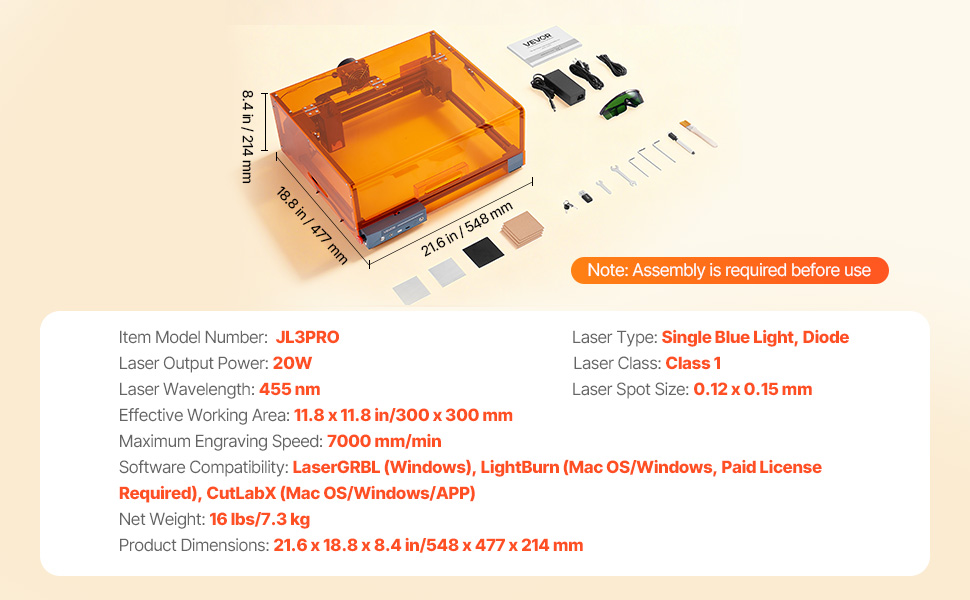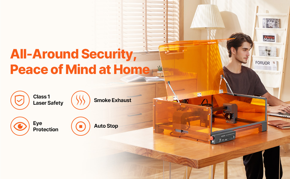 Unleash your creativity with an 11.8 x 11.8 in working area and 7000 mm/min engraving speed. Cut through 0.3 in basswood in a single pass and achieve fine details with a 0.12 x 0.15 mm blue laser spot. With laser Class 1 design, it supports LaserGRBL, LightBurn (paid), and CutLabX APP.