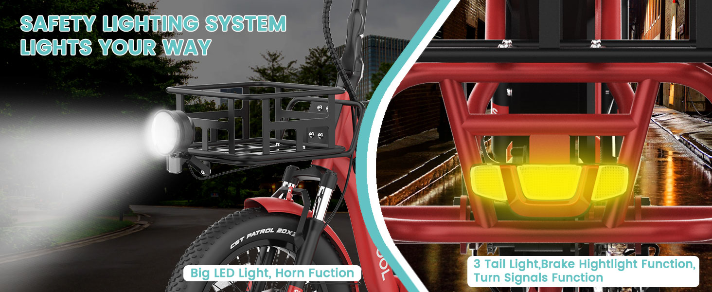 - Reliable Safety System: Dual disc brakes with responsive stopping power, paired with bright front and rear lights for safer day and night riding