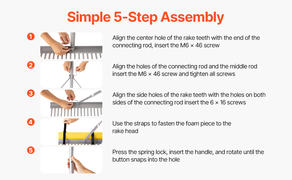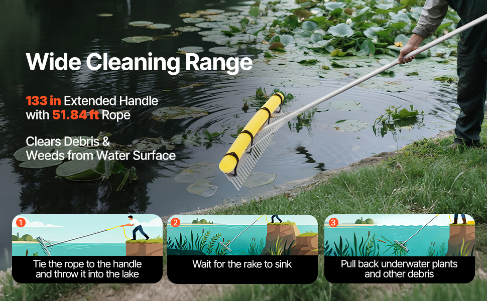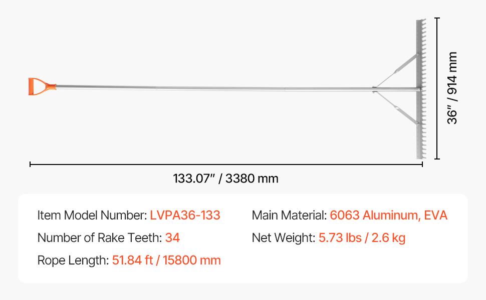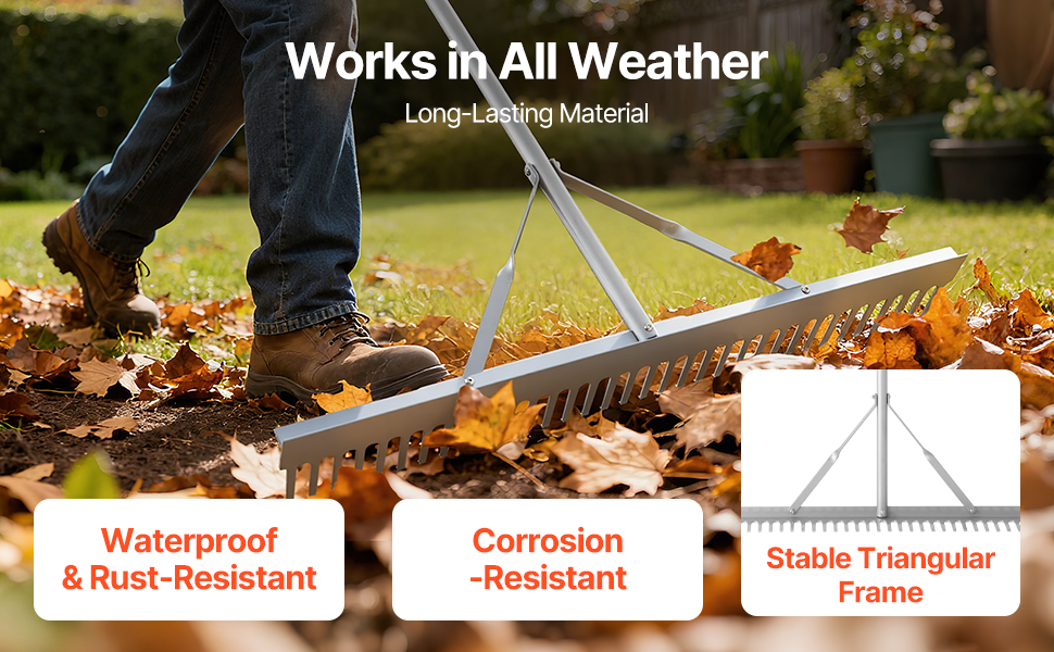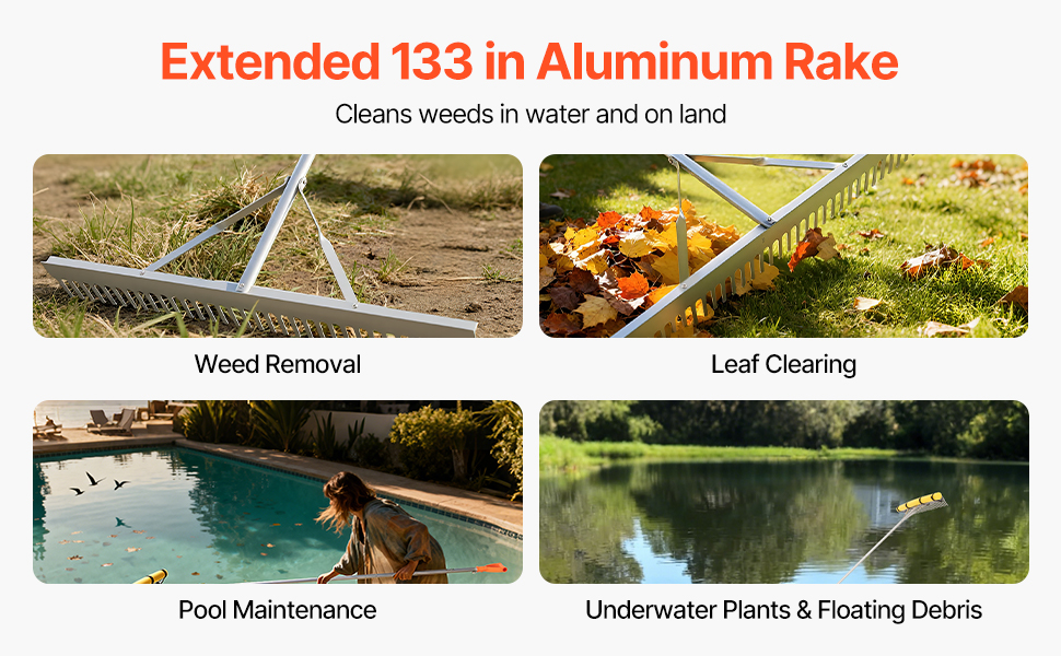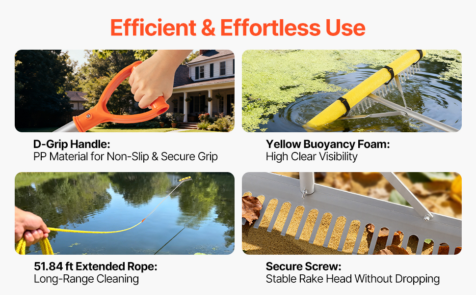 Made of an aluminum alloy handle and head, reinforced with a sturdy triangular frame, the leaf rake is water- and rust-resistant, corrosion-resistant, and maintains shape. It is suitable for leaves clearing, floating debris clearing, and ensuring long-term outdoor use.