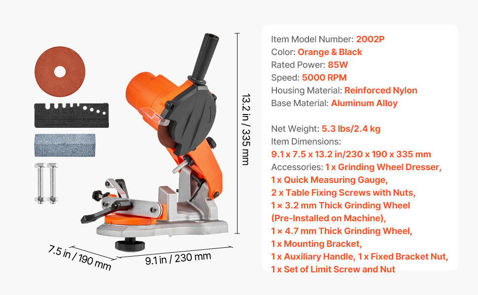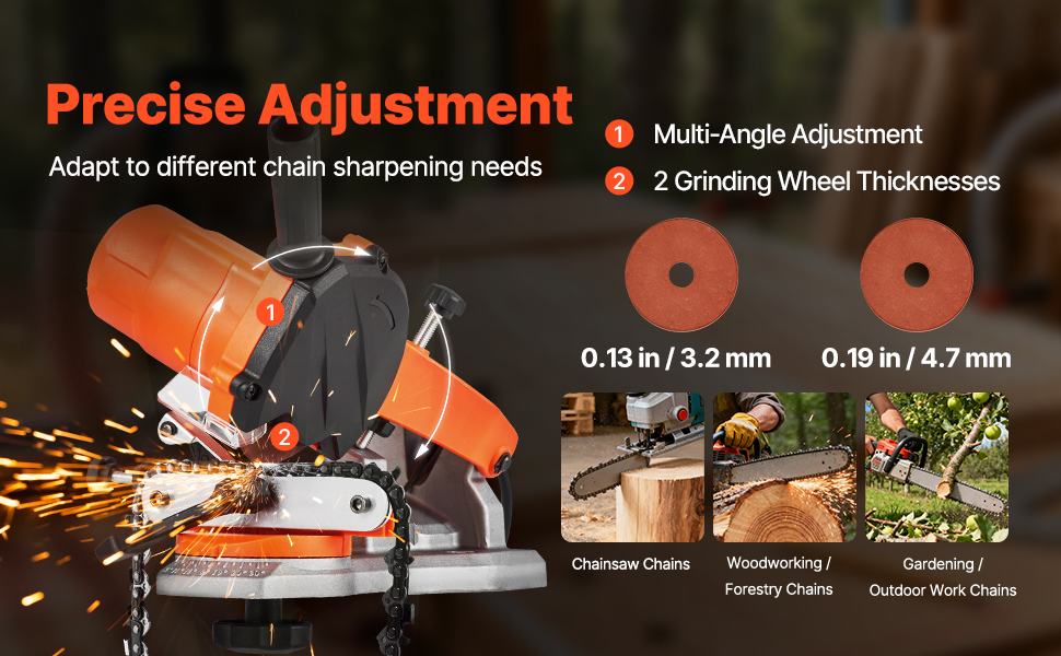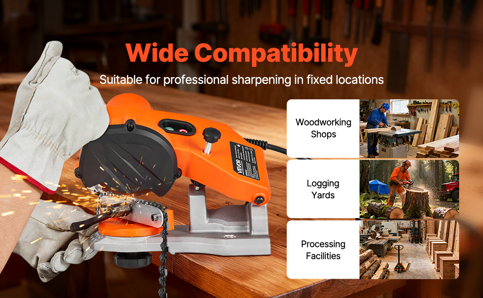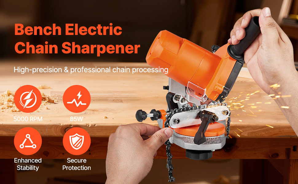 Quickly restore your chain sharpness with VEVOR electric bench chainsaw sharpener. With 85W strong power, 5000RPM speed, and 2 grinding wheels, it handles different chain types efficiently. An indispensable tool for gardeners, repair workers, DIY enthusiasts.