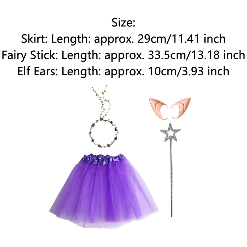 Set Include: 1Pc Skirt, 1Pc Fairy Stick, 1Pc Garland, 1Pair Elf Ears