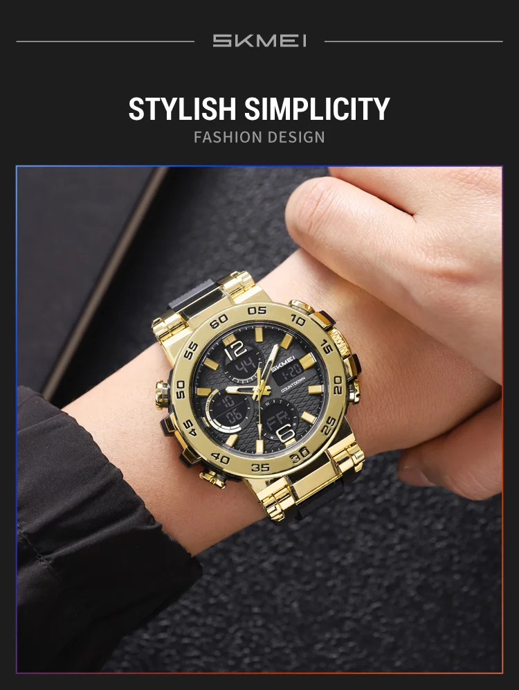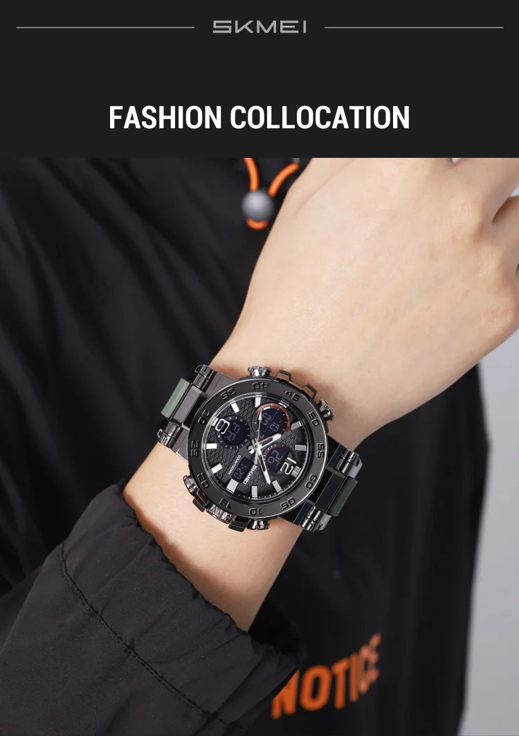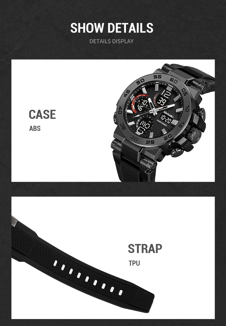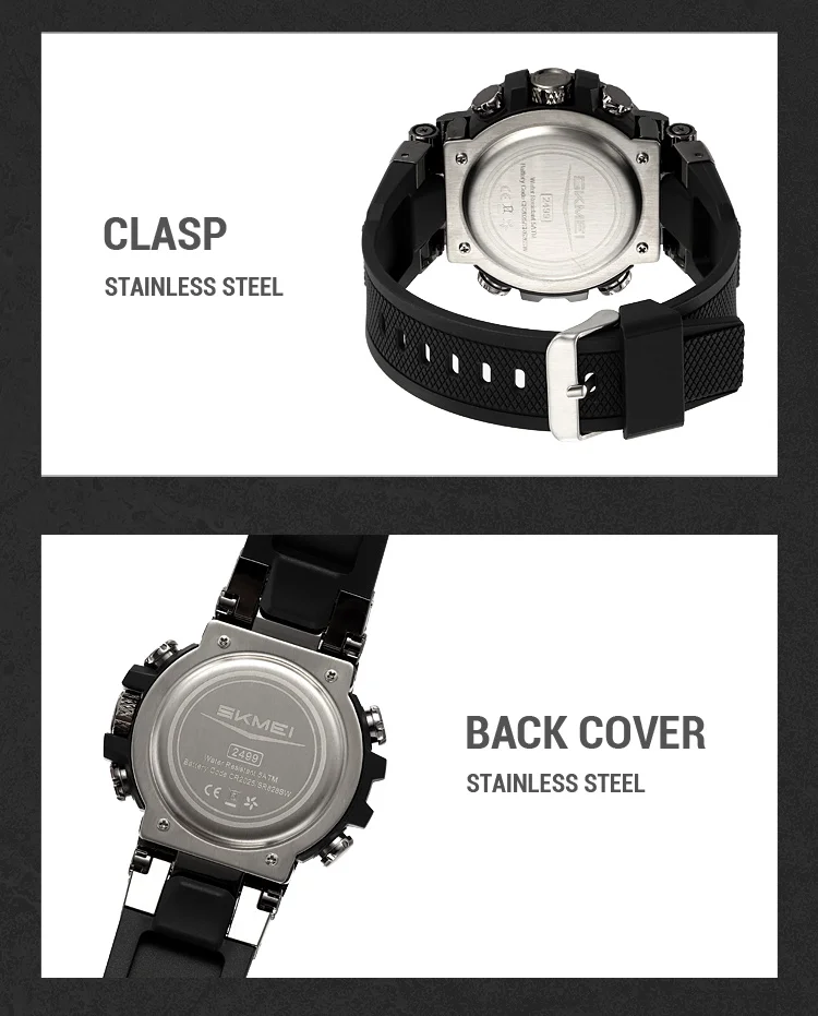 SKMEI Sport Waterproof Dual Digital Display LED night light Watches with Calendar Analog timing Alarm Clock West Coast 2499 Model: 2499 Movement: Electronic Movement Battery model: CR2025/SR626SW Waterproof: 50 meters Net weight of watch: 66.2g Mirror: resin Case: ABS Strap: TPU Buckle: Stainless steel Bottom cover: stainless steel Dial width: 54.7mm Dial height: 59.5mm Dial thickness: 18mm Strap width: 30.2mm Watch total length: 280mm 3. Time, stopwatch timing, date Alarm clock, week, LED night light Hourly clock, 12/24-hour clock count down.