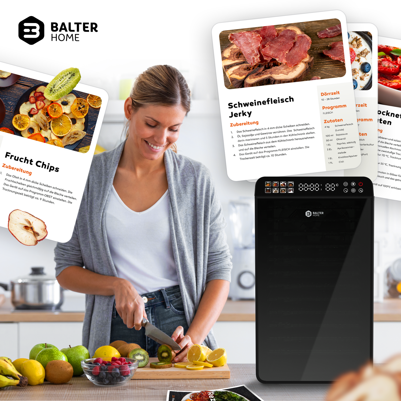 Zum Lieferumfang gehören 3 Silikonmatten, Tropfschale, Handschuh und Rezeptbuch – für einen schnellen Start und grenzenlose Vielfalt beim Dörren. Mit dem Balter DA-106 verwandeln Sie frische Zutaten in gesunde Snacks – natürlich, energiesparend und voller Geschmack.