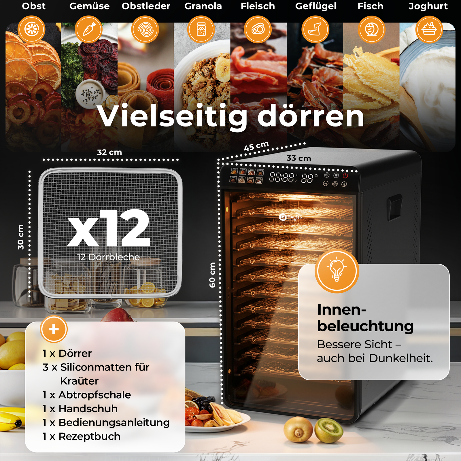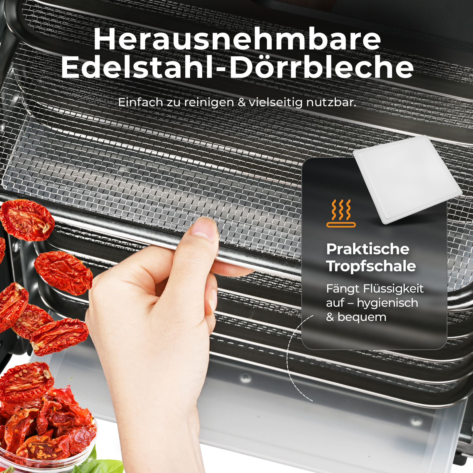 Der Dörrautomat Edelstahl überzeugt mit durchdachtem Design: Innenbeleuchtung, Sichtfenster und ein modernes Touch-Display machen die Bedienung besonders komfortabel. Die 12 Edelstahl-Dörrgitter sowie die Tropfschale sind leicht entnehmbar und spülmaschinenfest.