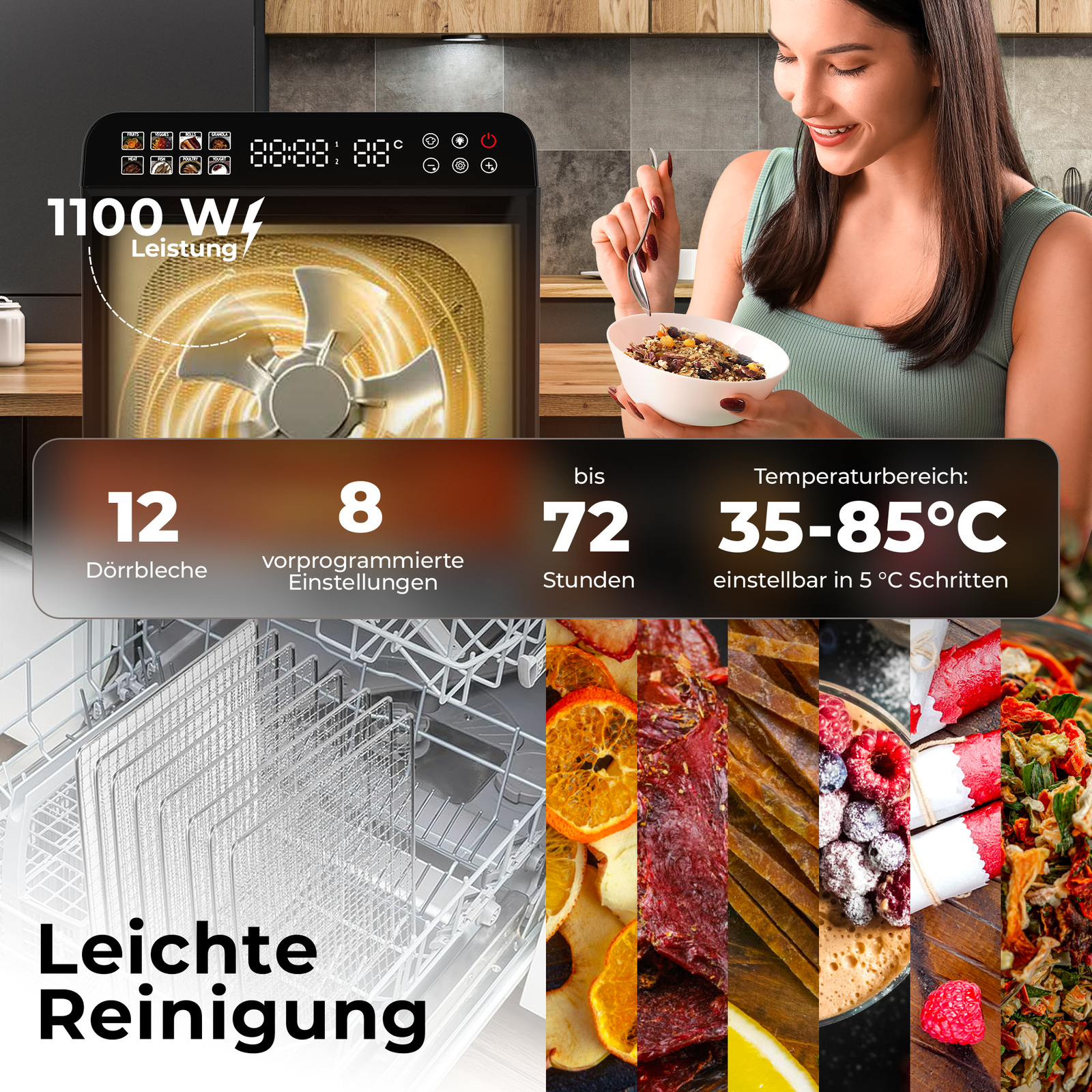 Mit 1100 W Leistung, präziser Temperaturregelung in 1 °C-Schritten (35–85 °C) und einem Timer bis 72 Stunden behalten Sie stets die volle Kontrolle. Acht vorinstallierte Programme erleichtern die Bedienung und sorgen für perfekte Ergebnisse bei jedem Dörrgut – von Obstchips über Beef Jerky bis hin zu hausgemachtem Joghurt.