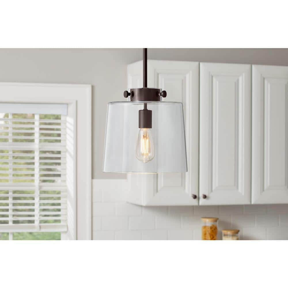 Enrich your interior design with the classic lighting of this one-light pendant. An ideal choice over kitchen islands or in dining areas this pendant light offers transitional style that will suit any home decor. Its clear glass shade casts a beautiful glow. Steel construction offers longevity of this mini pendant light. It accepts one 40-Watt medium-base bulb which is not included. This ceiling light offers a maximum hanging height of 61 in. Steel construction built for durability and style Uses one 40-Watt medium base bulbs (not included) Ceilings mount applications for dining room and kitchen lighting Clear glass shade creates a beautiful glow when illuminated Includes assembly and installation parts Ideal for contemporary or transitional decor styles ETL Listed for indoor use