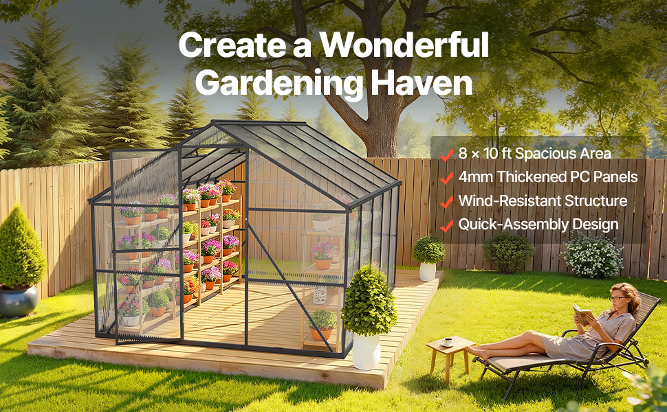 The 8 x 10 ft polycarbonate greenhouse provides a sturdy, ideal space for growing plants, making your backyard or garden a productive and protected growing area.
