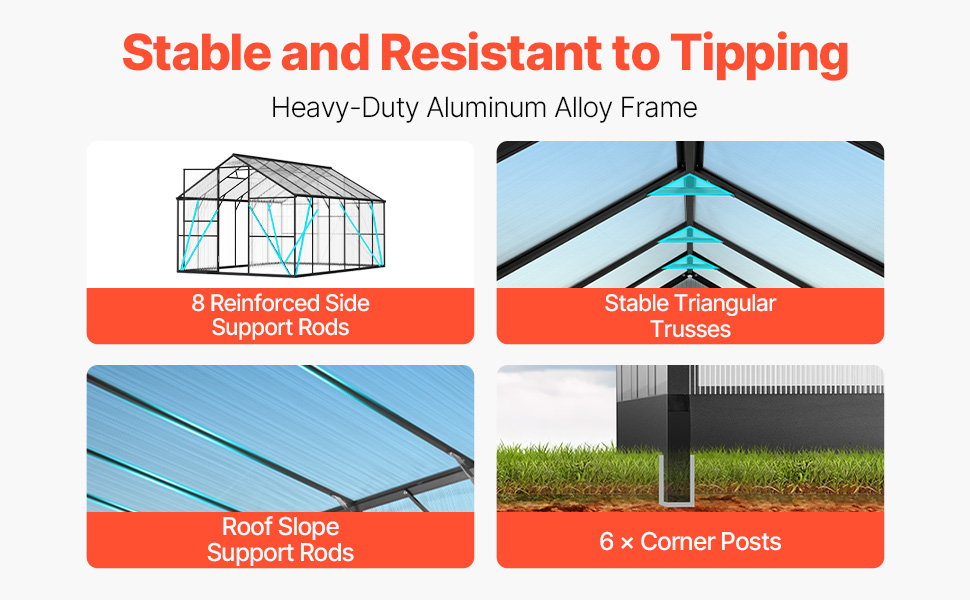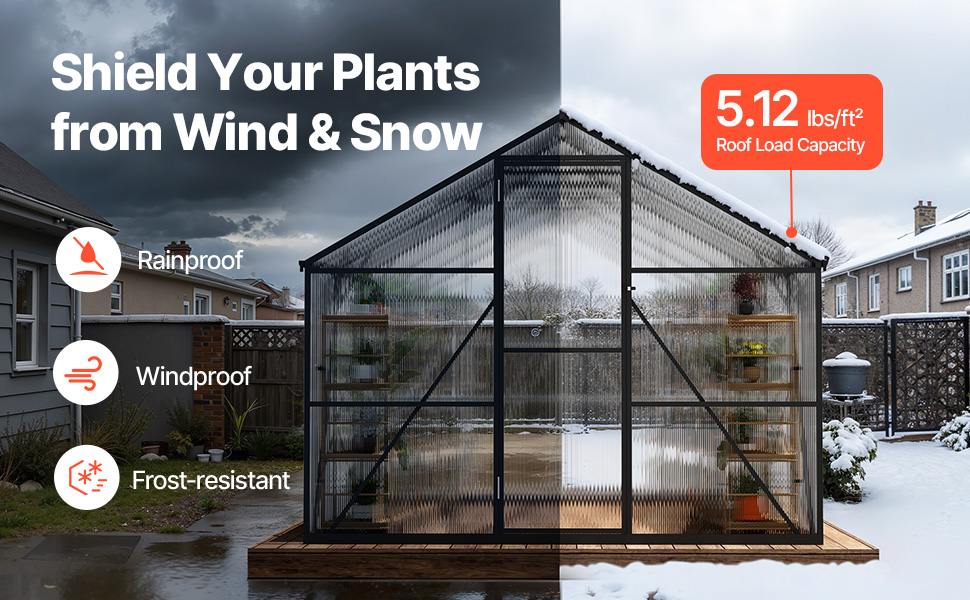 Weather-Resistant Structure: Reinforced triangular side and roof supports, along with 6 corner posts, allow secure anchoring on soft ground. Roof supports up to 5.12 lbs/ft², and when properly installed and reinforced, the garden greenhouse can withstand winds of 6–7 on the Beaufort scale, keeping your plants secure