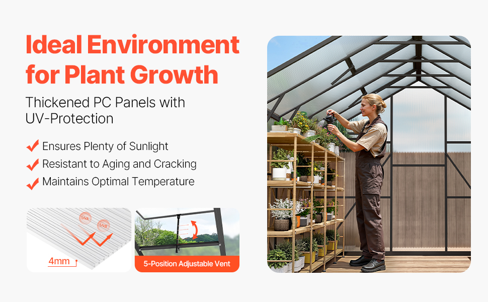Optimized Growing Environment: The high-transparency PC panels provide ample sunlight while protecting against wind, rain, and UV rays, creating a year-round suitable environment. The polycarbonate green house features 5 adjustable ventilation windows, rain gutters, door stoppers, and door locks for improved airflow and convenient operation