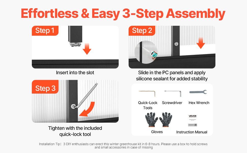 Quick Assembly Design: The walk-in greenhouse features a quick-assembly system and slide-in panel design. With the included fast-lock tools, you can easily assemble the outdoor greenhouse in about 2.5 hours (recommended 2-person setup). Using the included tape or silicone sealant can further strengthen the structure and extend its lifespan.