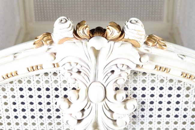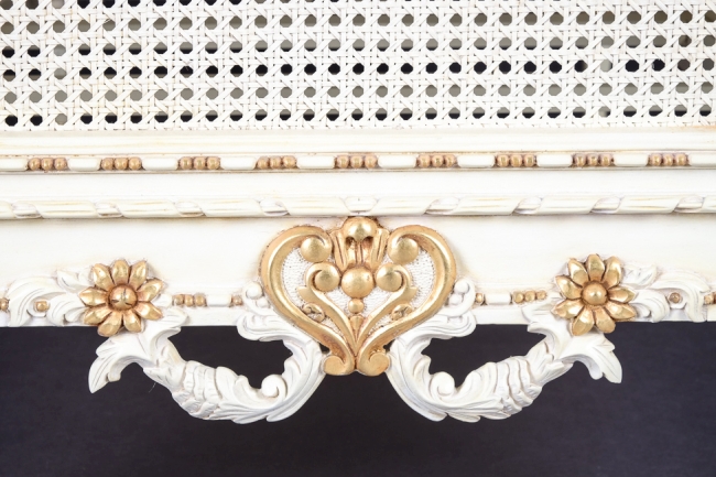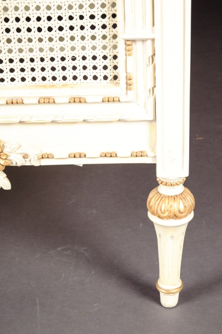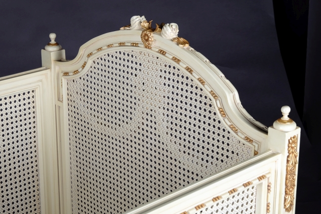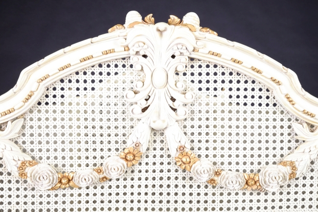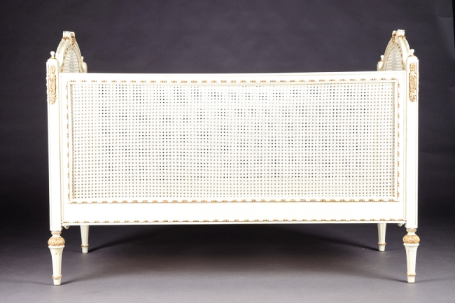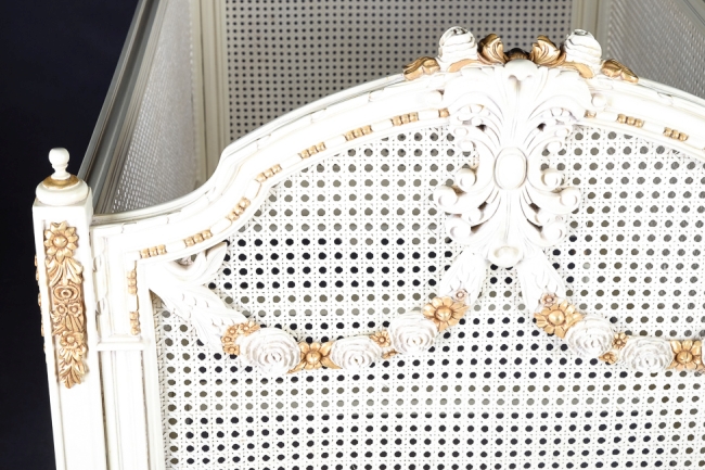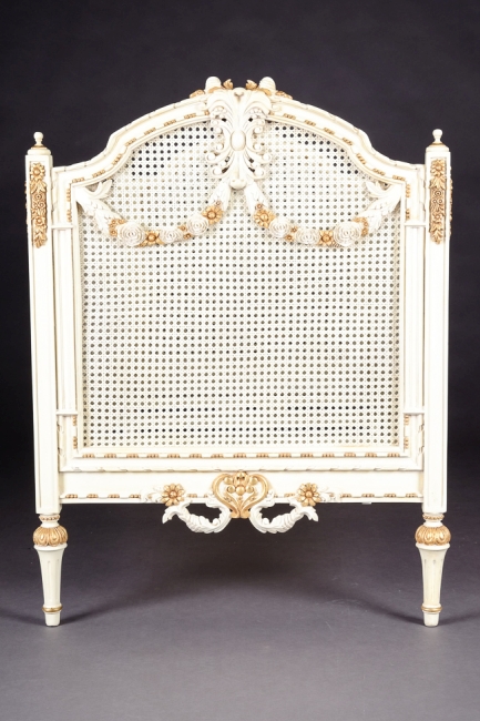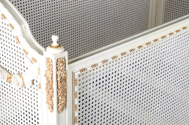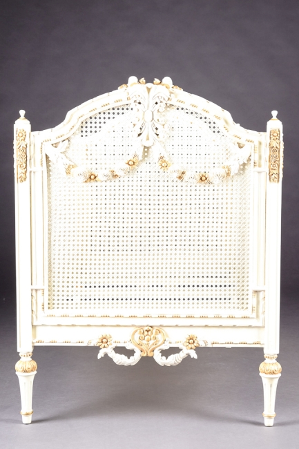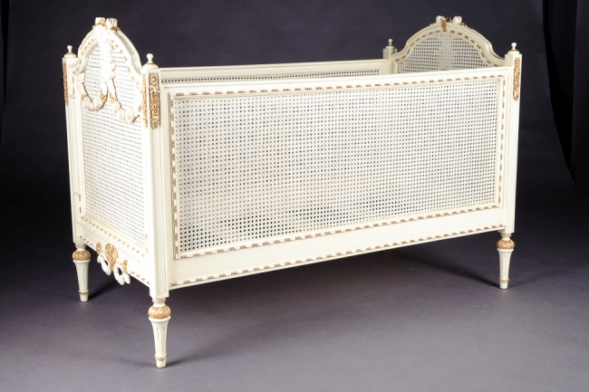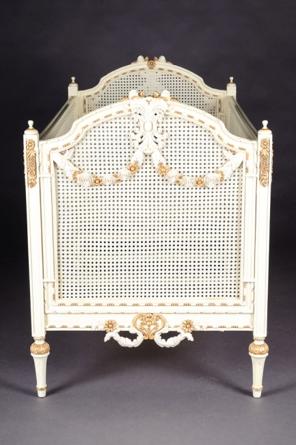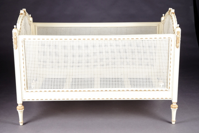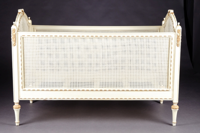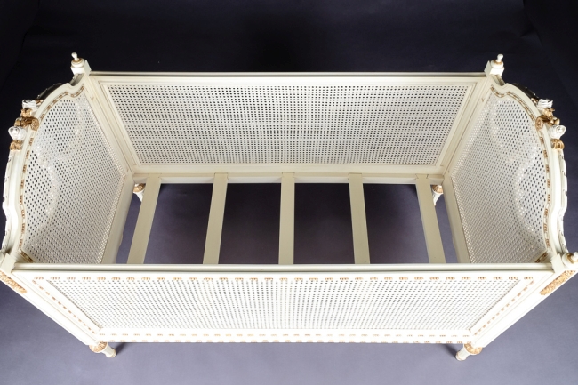 Lit bébé baroque de style Louis XVIBois de hêtre massif, finement sculpté, coloré et doré. Tressé de tous côtés.