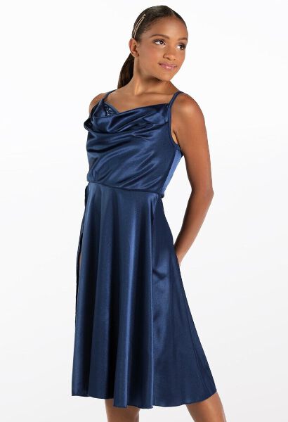 Brand: Weissman 13193 B25-597 Size: Large Child Colors: Navy Great For: Contemporary Modern Lyrical Ballet Features: Solid Cami Dress Trunks Lycra Charmeuse cowl neck dress