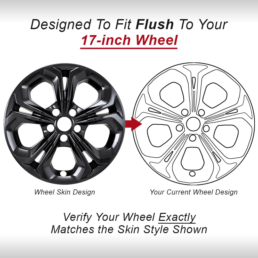 This set of 4 wheel skins are perfectly designed to fit your vehicle's 17-inch factory wheels. These wheel skins feature a 5 Double Spoke style and is constructed with high-quality, automotive grade ABS and finished with a sleek Gloss Black finish!