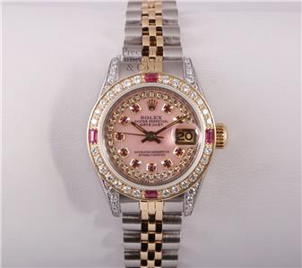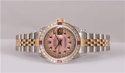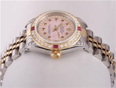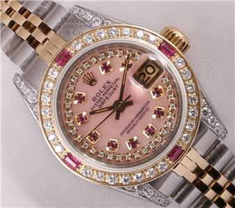 | DIAL | Custom Pink Mother of Pearl Dial with String Diamonds & Ruby Hour Markers. |