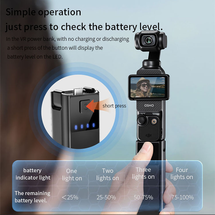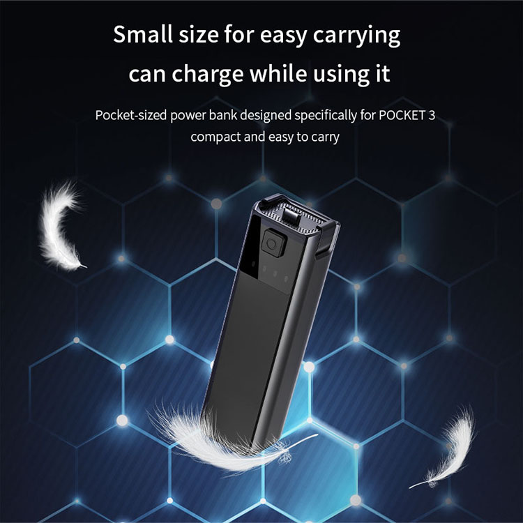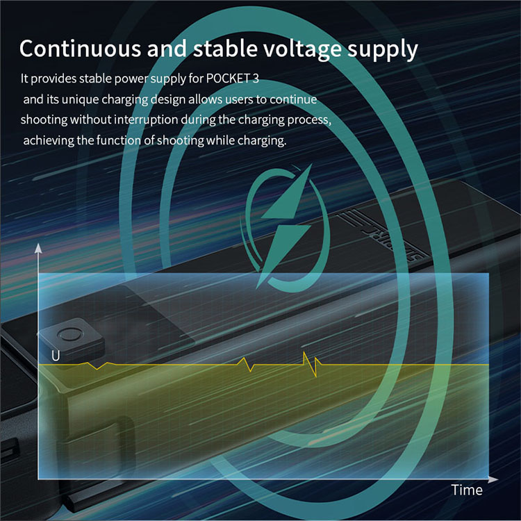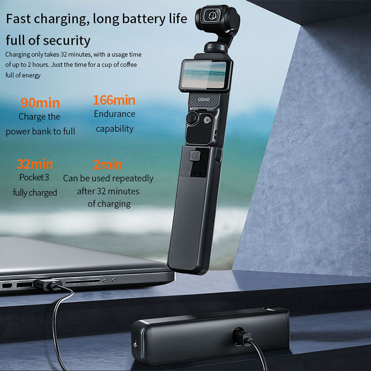 l It can charge the Osmo Pocket 3 about 1 time, and extend the operation time for Osmo Pocket 3 about 100% when connected, effectively extending the shooting time and realizing the portable battery life function of charging and shooting