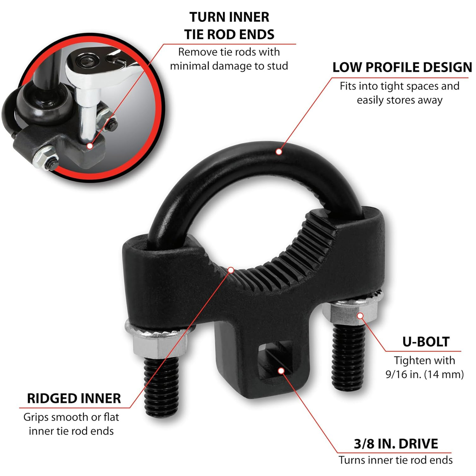 Easy Installation: Use the 3/8" drive extension to operate by simply sliding the tool over the end and tightening the collar. The multi-purpose wrench features a thin-profile design that works as you insert a socket wrench or breaker bar and turn, the multipurpose wrench can grip the tie rod securely.