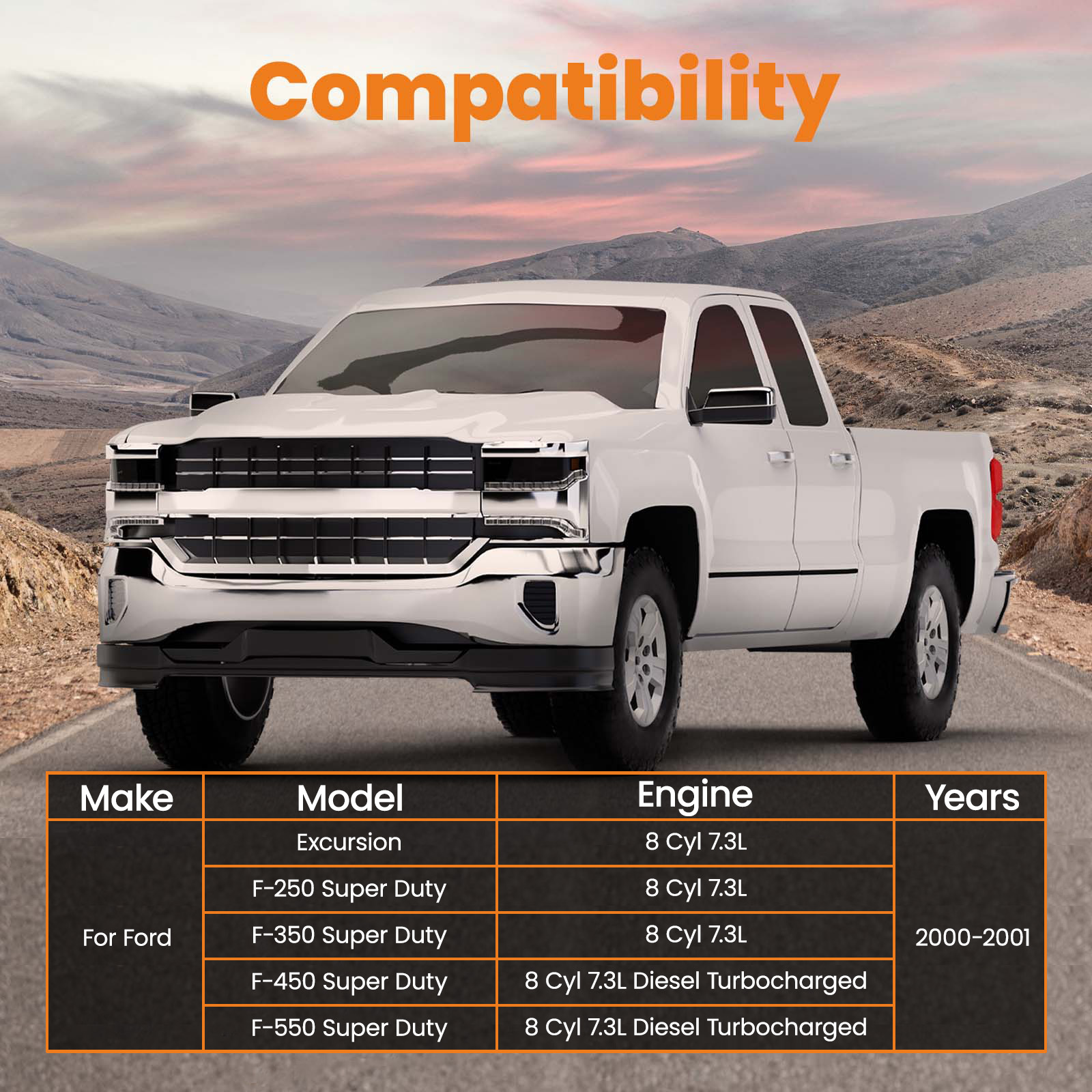 | 2000-2001 for Ford F-450 Super Duty | 8 Cyl 7.3L Diesel Turbocharged 4AT 4R100, 5MT, 6MT |