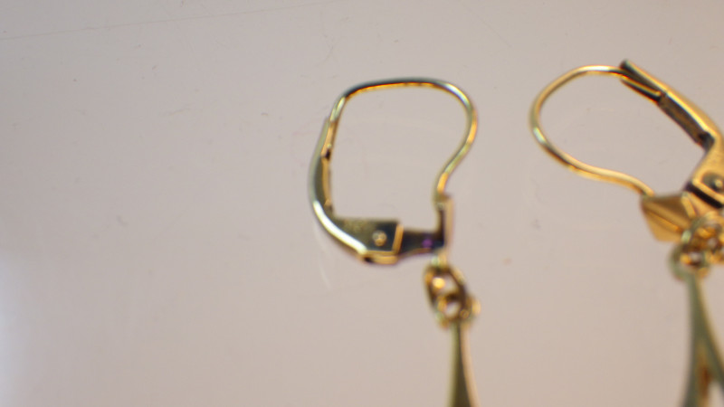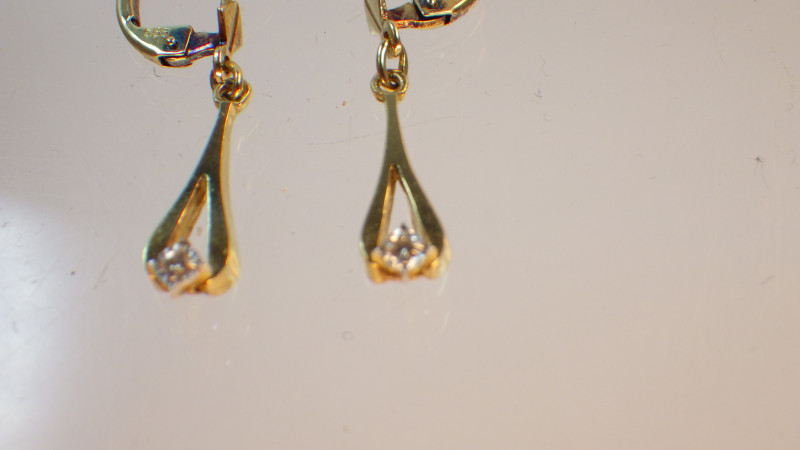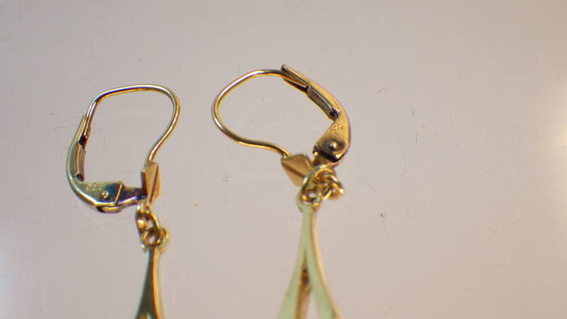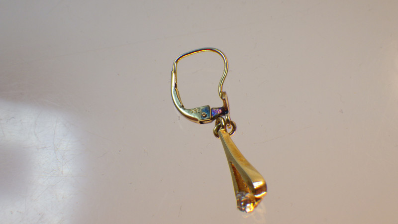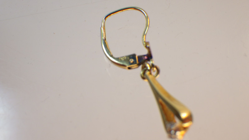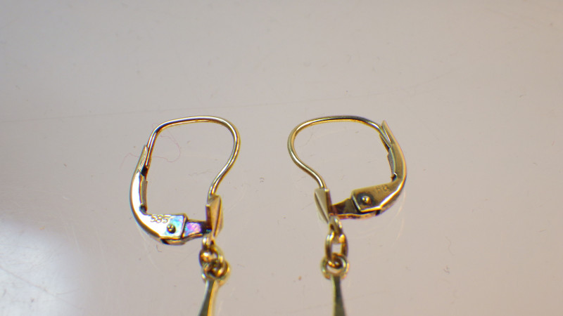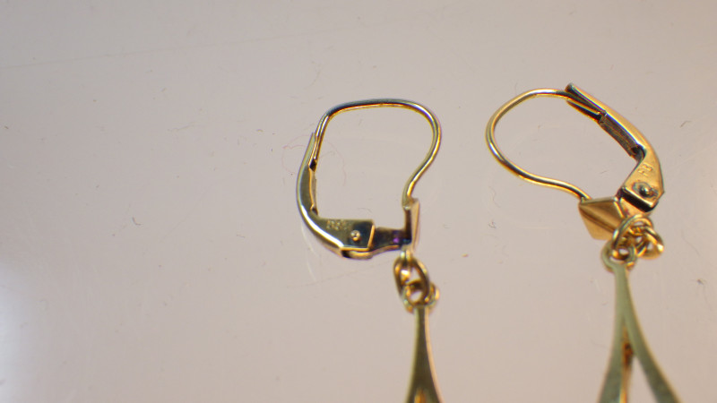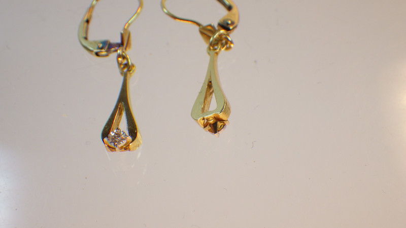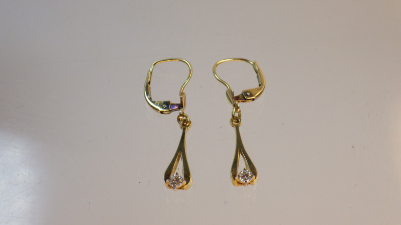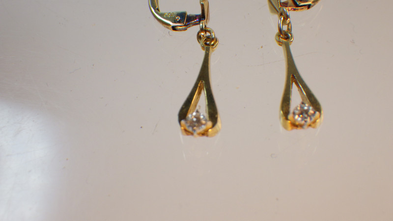 Diese schönen Ohrringe stammen aus einem Nachlass. Die Ohrringe sind aus echten 585 Gelbgold und Weißgold hergestellt worden. Sie sind jeweils mit einem echten kleinen Diamanten besetzt. Sie sind sehr schön verziert. Sie sind mit 585 und FB gestempelt. Die Ohrringe sind ca 3,0 cm lang unten gemessen ca 0,5 cm breit und wiegen ca 2,1 Gramm. Sie sind gebraucht. Ein Paar schöner dekorativer Diamant Ohrringe.