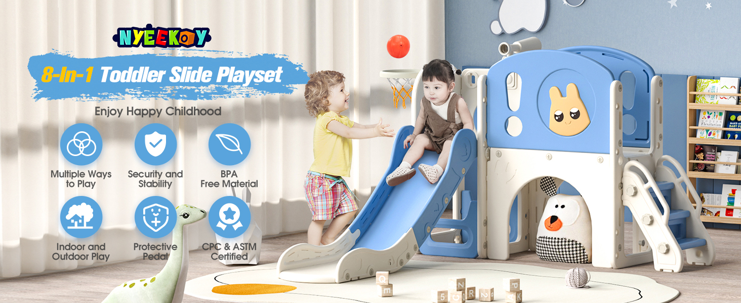 Setting up is quick and easy with no tools required—just follow the clear instructions. Compact enough for living rooms yet durable for backyard use, this is the ideal all-in-one playground for children aged 1-3, providing endless fun wherever you place it.