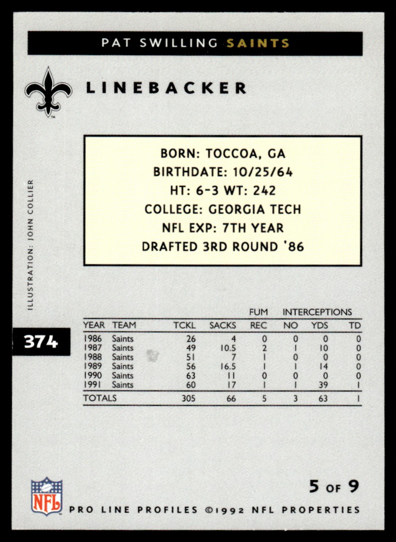 1992 Pro Line Profiles Pat Swilling New Orleans Saints #374