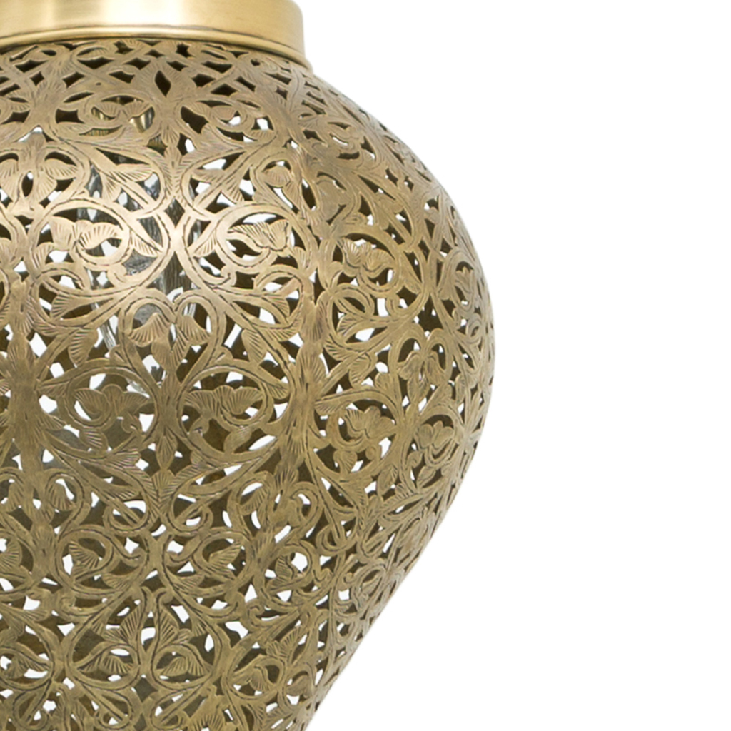 For more slender lighting pieces, our Qatara Flame pendant hangs eloquently as a fine example of the blend of traditional craft with contemporary designs. The flame pendant’s sculptural quality and its floral fretwork are cut and carved by hand by our craftsmen. The flame pendant features a brass canopy with an antique finish.