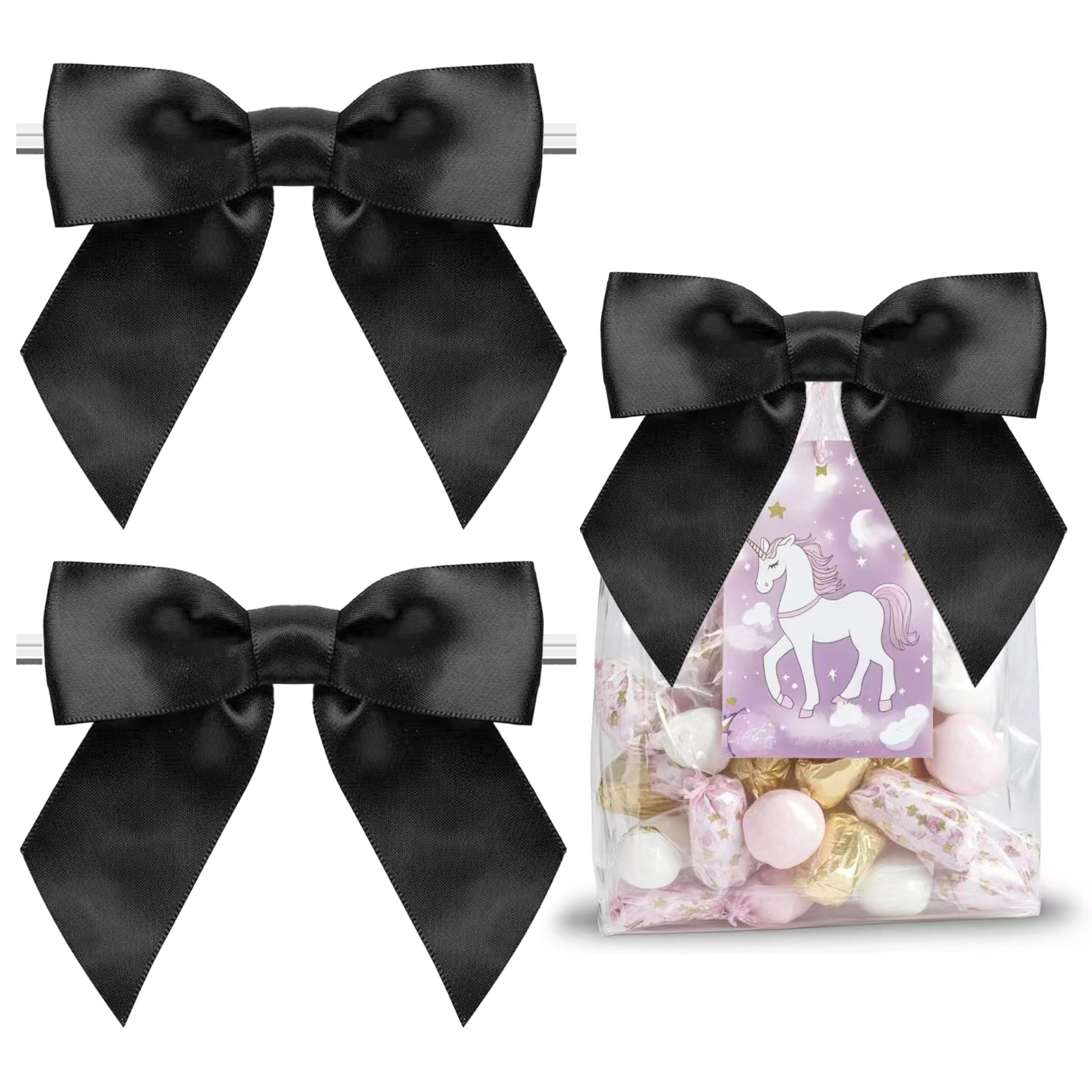 - 🎀【You Will Get 50 packs Black Twist Tie Bows in High Quality】These cute twist tie bows come in a pack of 50 packs, enough for your use and save for future. They are made of quality and sturdy satin ribbon material to hold and keep treats in bags. The pre-tied satin bows are handmade with great care under strict quality control to ensure they are durable.