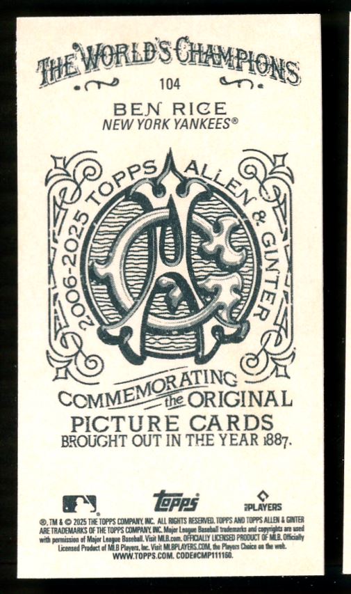 | 2025 Topps Allen & Ginter Mini A&G Back Ben Rice RC New York Yankees #104 |
