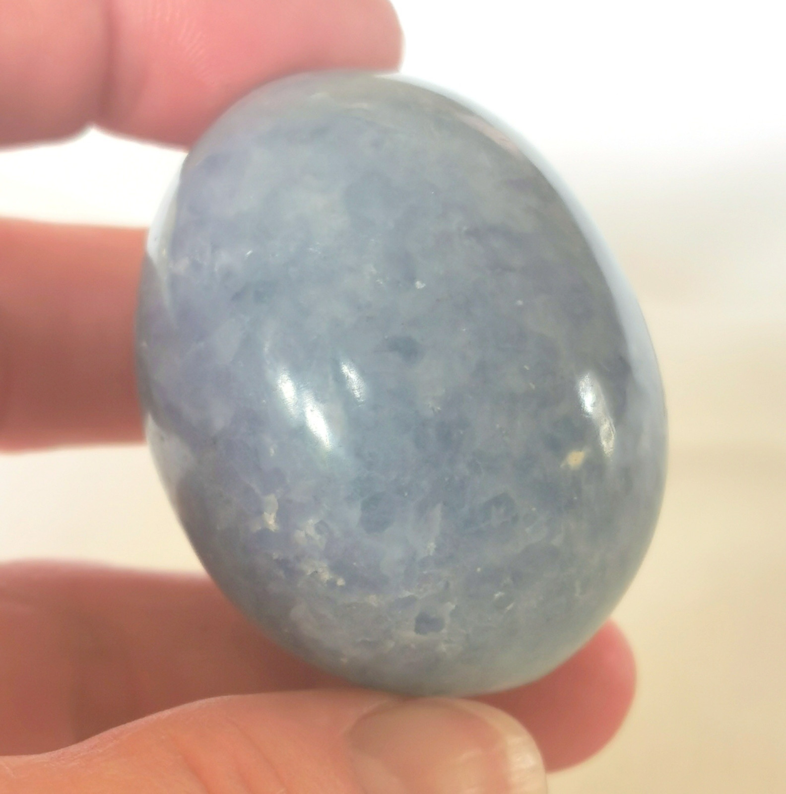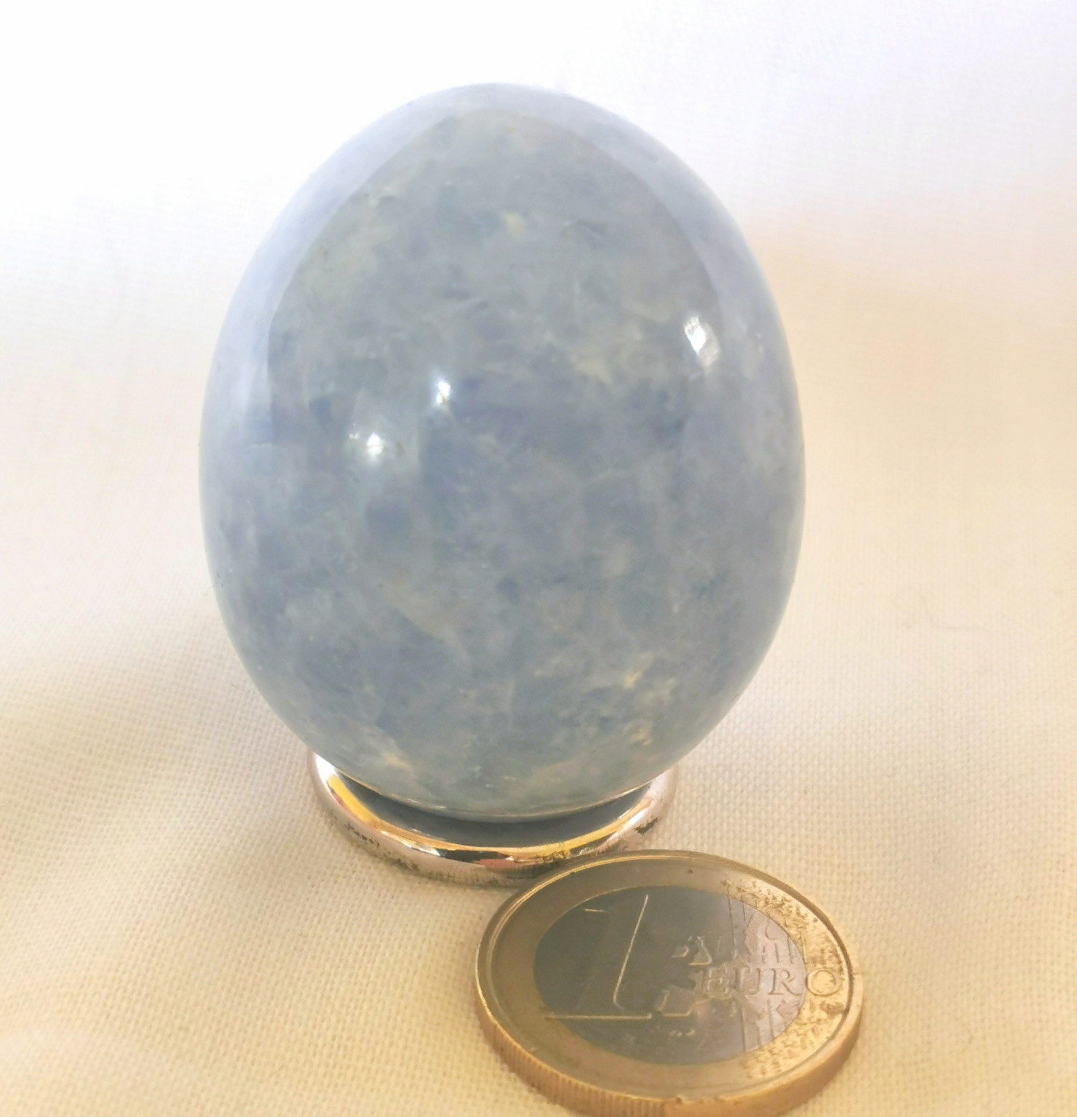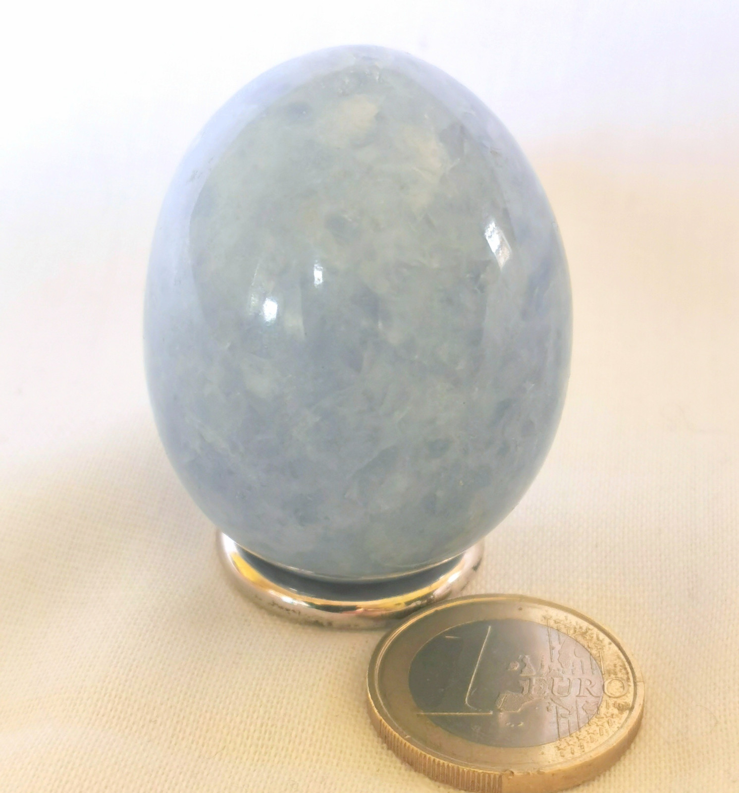 wunderbares blaues Calcit Ei aus Madageaskar, Abmessung 47 * 37 mm, Gewicht 96 Gramm, geliefert wird nur das Ei ohne die abgebildete Deko. ebay geht auf meine Kosten.
