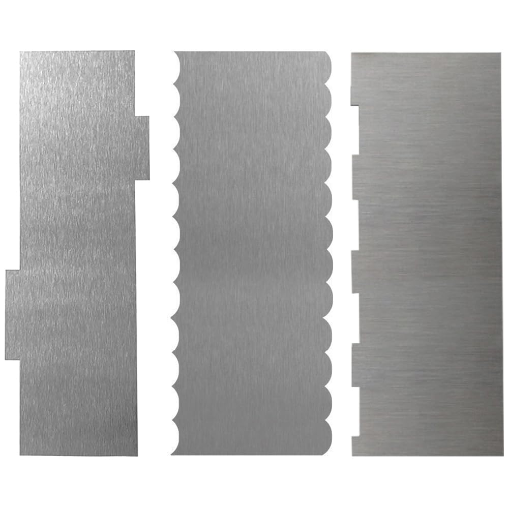 Transform your cake decorating experience with this versatile 3-pack of stainless steel cake scrapers. Each scraper features a double-sided design with distinct patterns, allowing you to create beautiful textures and finishes on your cakes, mousse, and buttercream desserts. The durable stainless steel construction ensures smooth, consistent results while working with various frosting types and textures. These professional-grade decorating combs help achieve those picture-perfect finishes that will make your desserts stand out. Whether you're creating elegant striped patterns, rustic textures, or smooth surfaces, these scrapers give you the precision and control needed for professional-looking results. Perfect for both home bakers and professional pastry chefs, these tools make decorating easier and more efficient. The comfortable grip and practical size make these scrapers easy to handle while working on your confectionery creations.