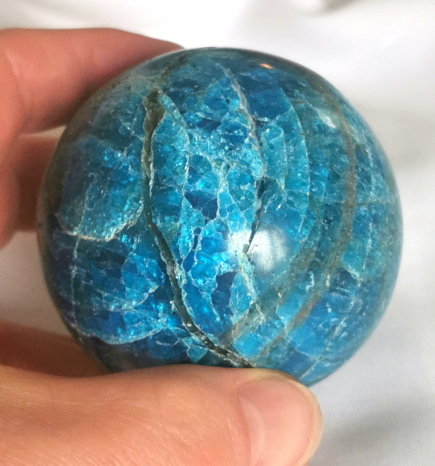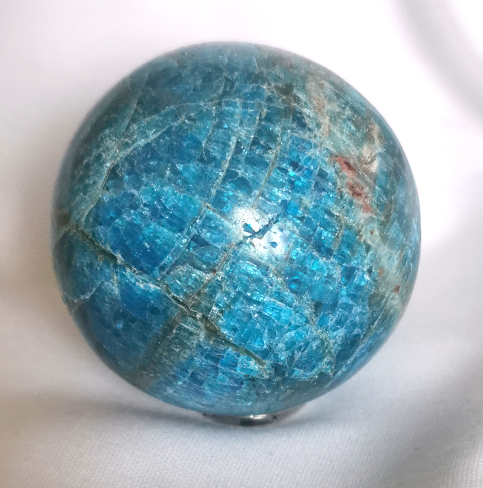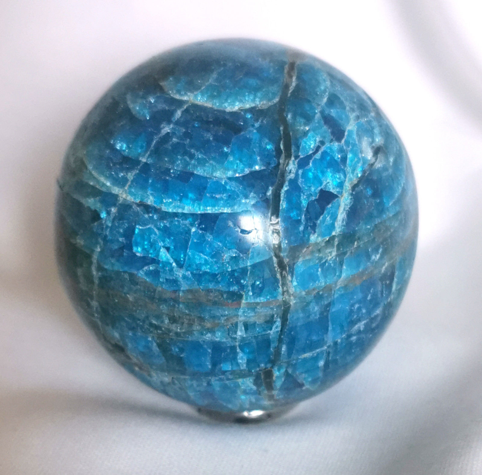wunderbare Petrol farbene Apatit Kugel aus Madagaskar, Durchmesser ca. 63 mm, Gewicht ca. 410 Gramm. ebay geht auf meine Kosten. Kleine Drusen und Vertiefungen auf der Oberfläche der Kugel sind natürlichen Ursprungs und machen sie zu einem besonderen Stück. ebay geht auf meine Kosten.