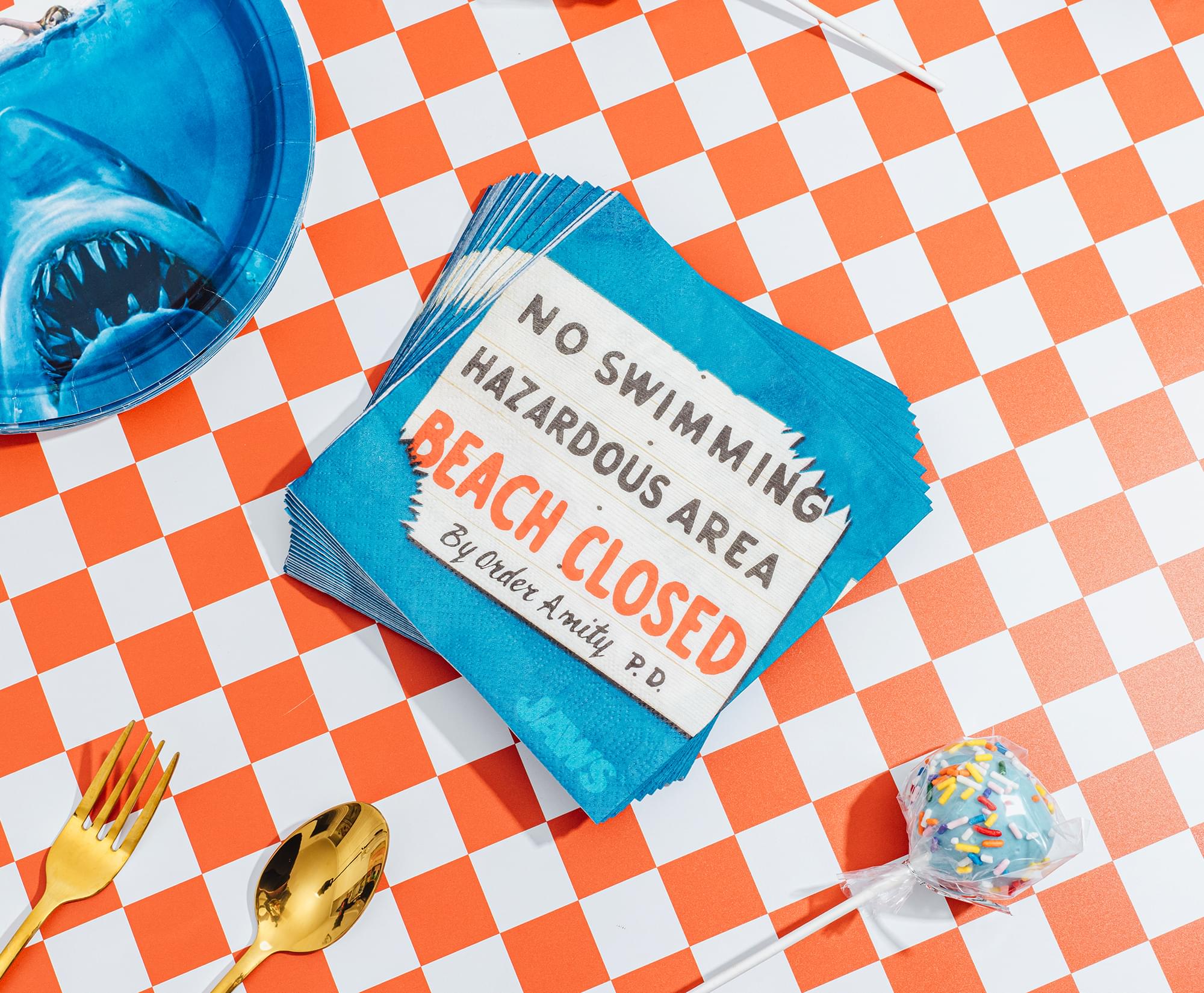 Inspired by the iconic thriller that made us all think twice about going in the water, this themed set redefines what it means to host a celebration. The paper cups and paper plates feature the iconic Jaws movie poster, with the massive great white shark rising from the depths. The napkins are printed with the warning, "No Swimming. Hazardous Area. Beach Closed," as a clever nod to the Amity Island beach sign.