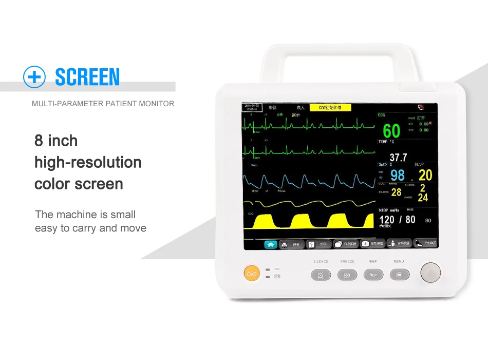 8'' color TFT LCD with high-resolution displays patient parameter and waveform, and alarm, bed NO, clock, state and other information provided by the monitor synchronously.