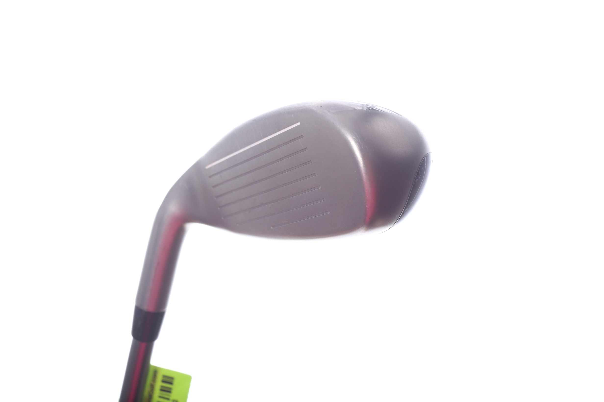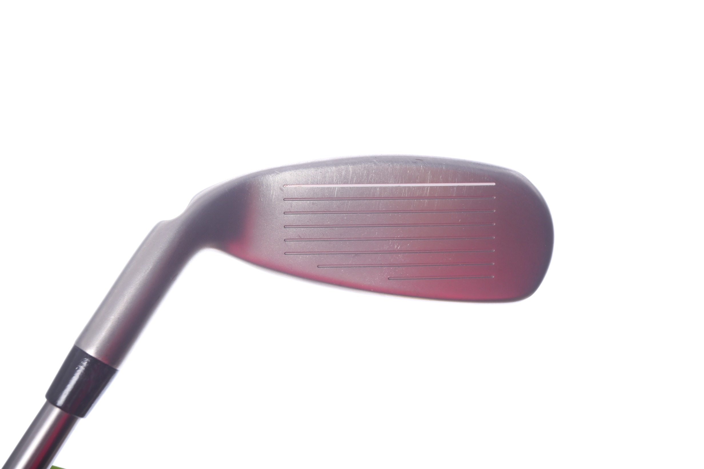 This hybrid is in average condition for its age. It has been well played by its former owner, and shows cosmetic wear including scratches, nicks, and paint chips on the face, sole, and crown. This shaft is around 4 inches shorter than a standard sized Men's 3 Hybrid shaft.