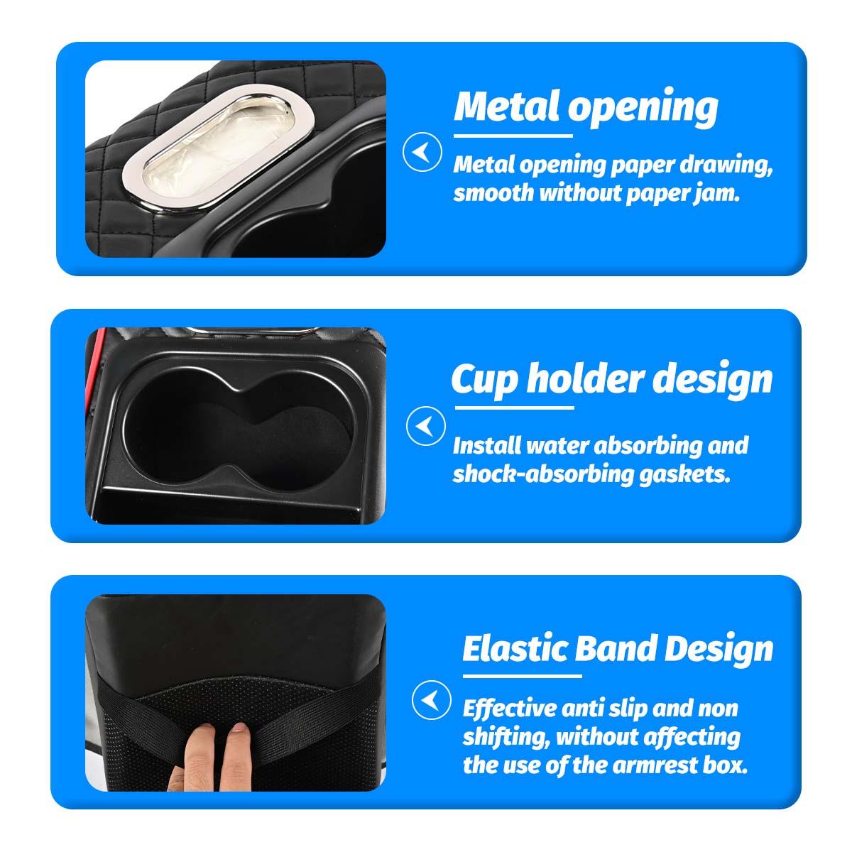 2.Easy Installation: The Car Armrest Storage Box adopts an elastic strap fixing design, easily fixed on the center console, directly installed without tedious installation steps