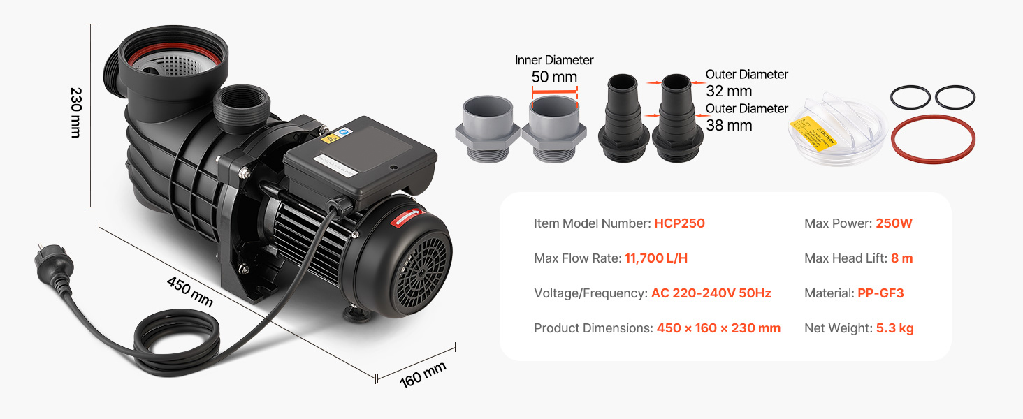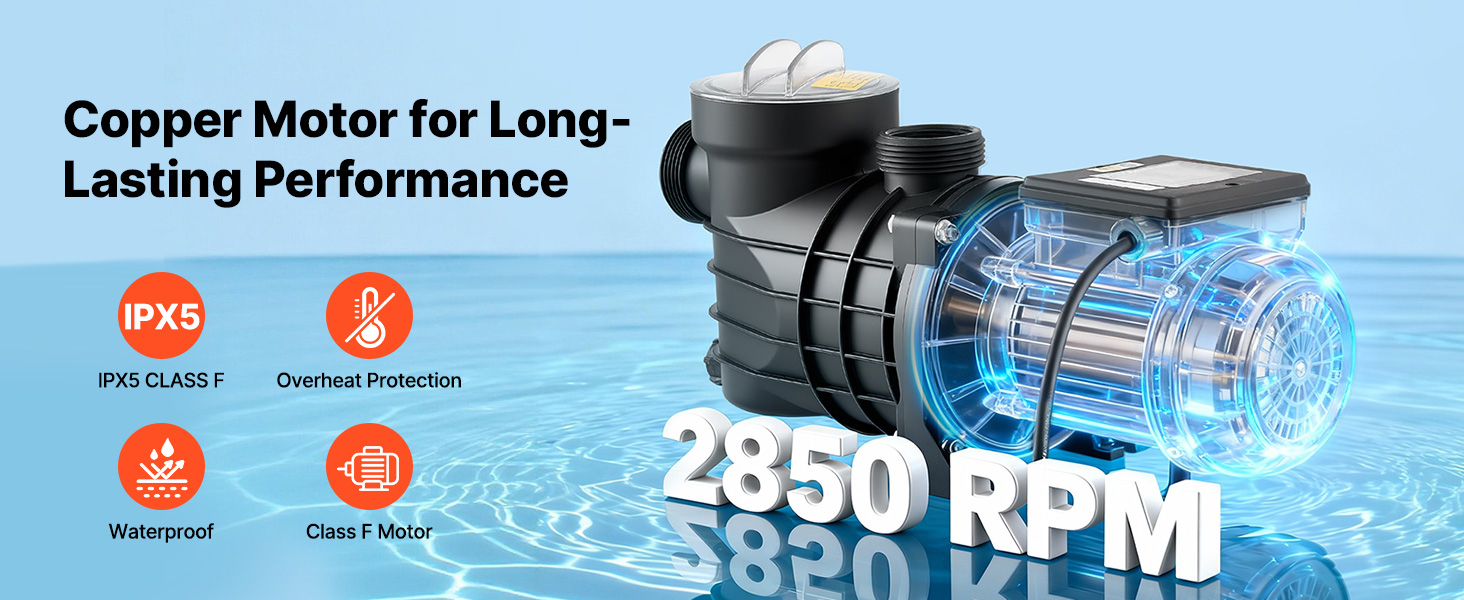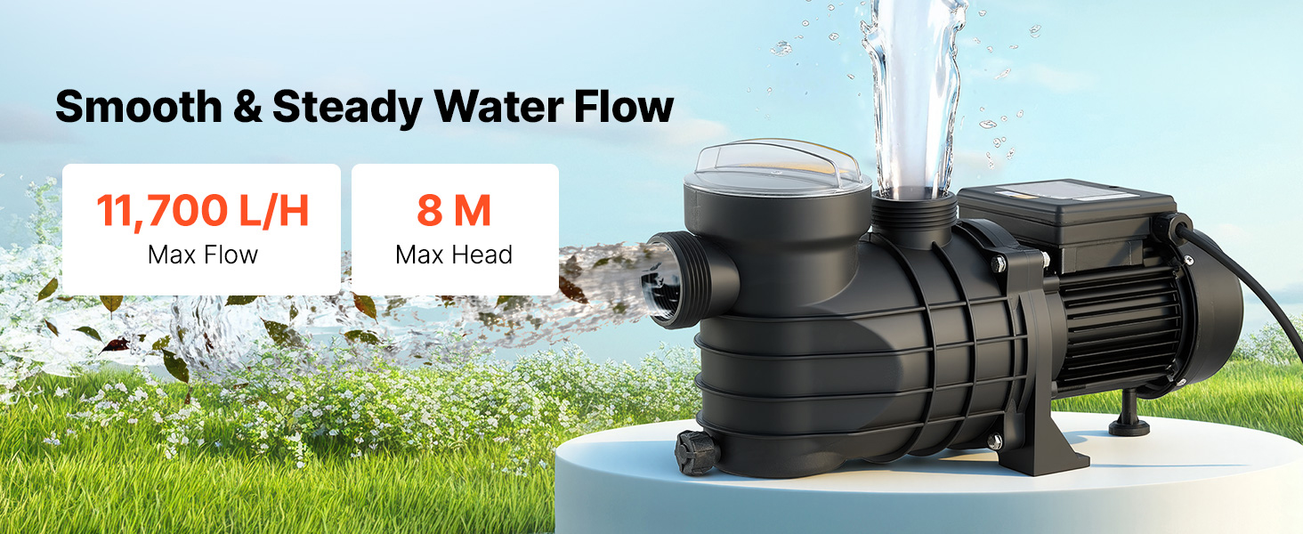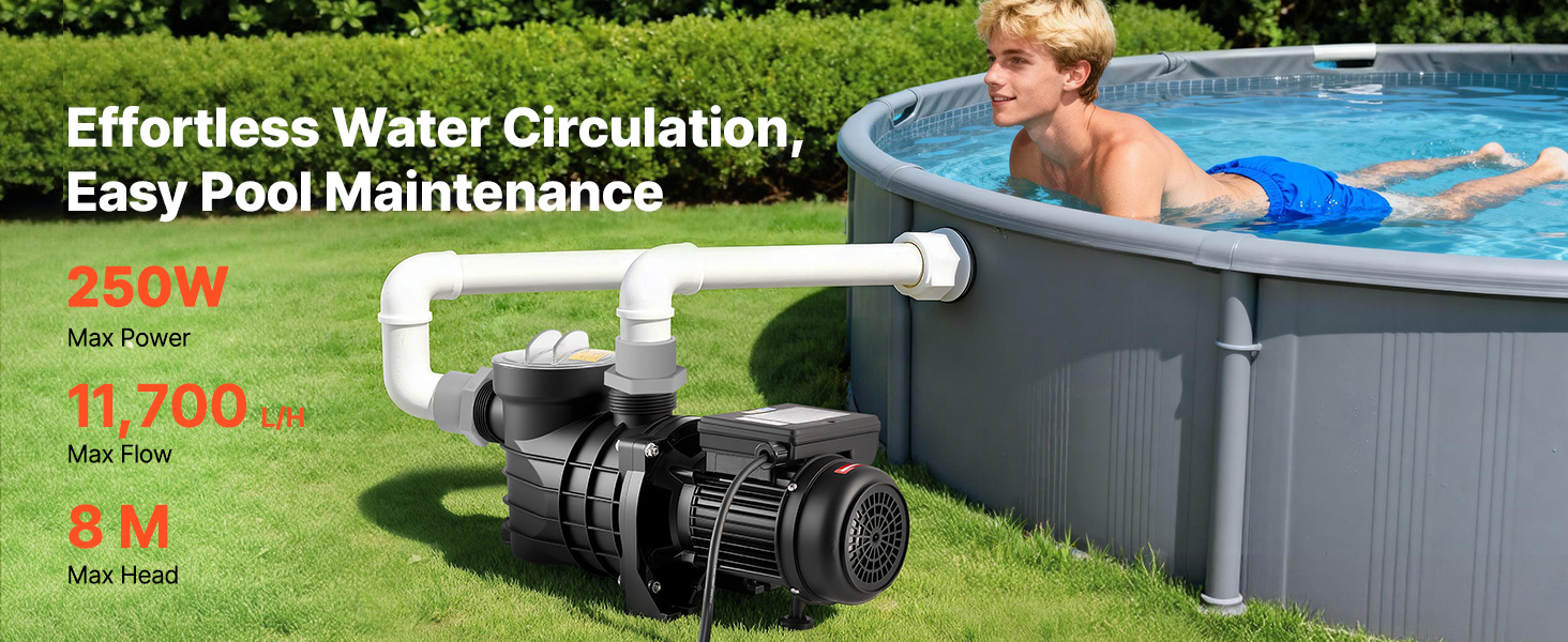 - Effiziente 250-W-Poolpumpe: Ausgestattet mit einem langlebigen Kupfermotor bietet diese Poolpumpe einen stabilen, kraftvollen und leisen Betrieb. Mit einer maximalen Förderleistung von 11.700 L/H und einer maximalen Förderhöhe von 8 m gewährleistet sie eine effektive Wasserzirkulation für ein angenehmes und sauberes Badeerlebnis.
