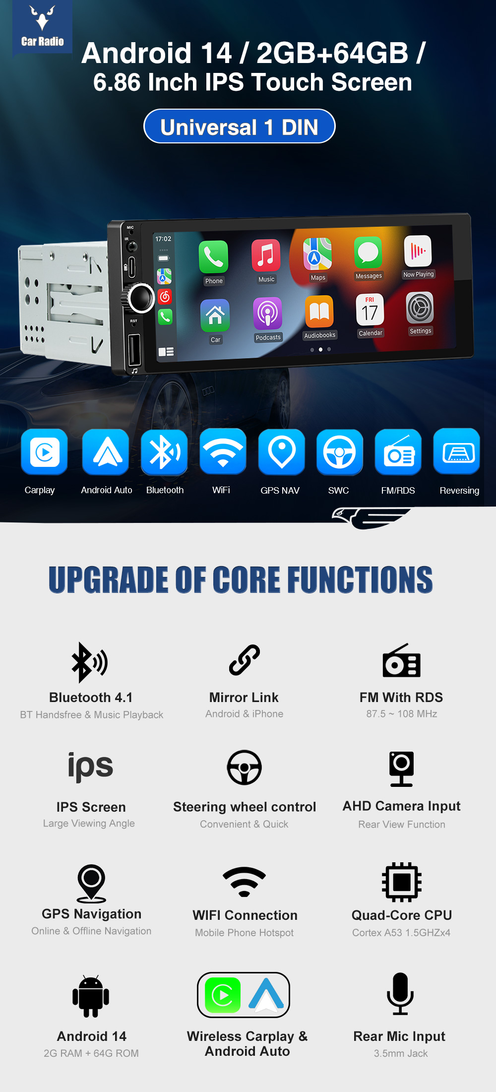 1 DIN Android 14 Car Radio with Touch Screen – The Android car radio with 6.86 inch IPS capacitive touch screen, 2GB RAM and 64GB ROM provides enough space to download your favourite apps and videos, so driving won't be boring anymore. 178x108x50(50mm) installation size, fits for most car with 1 DIN openning. With front USB input/USB type C, it supports fast mobile phone charging. With the rear microphone input, you can add a microphone to make your voice clearer (optional).