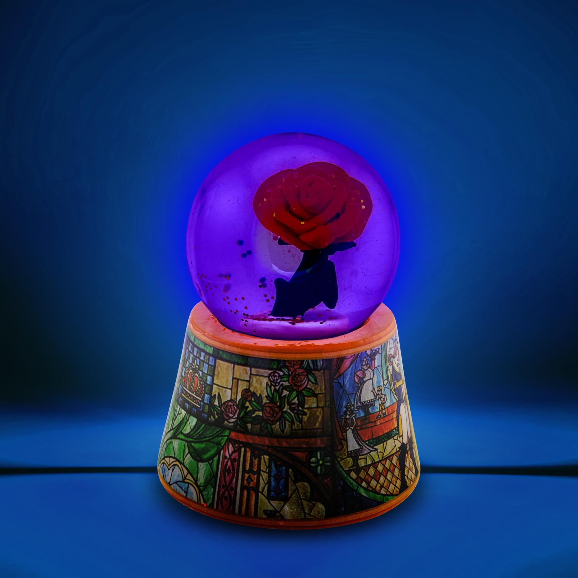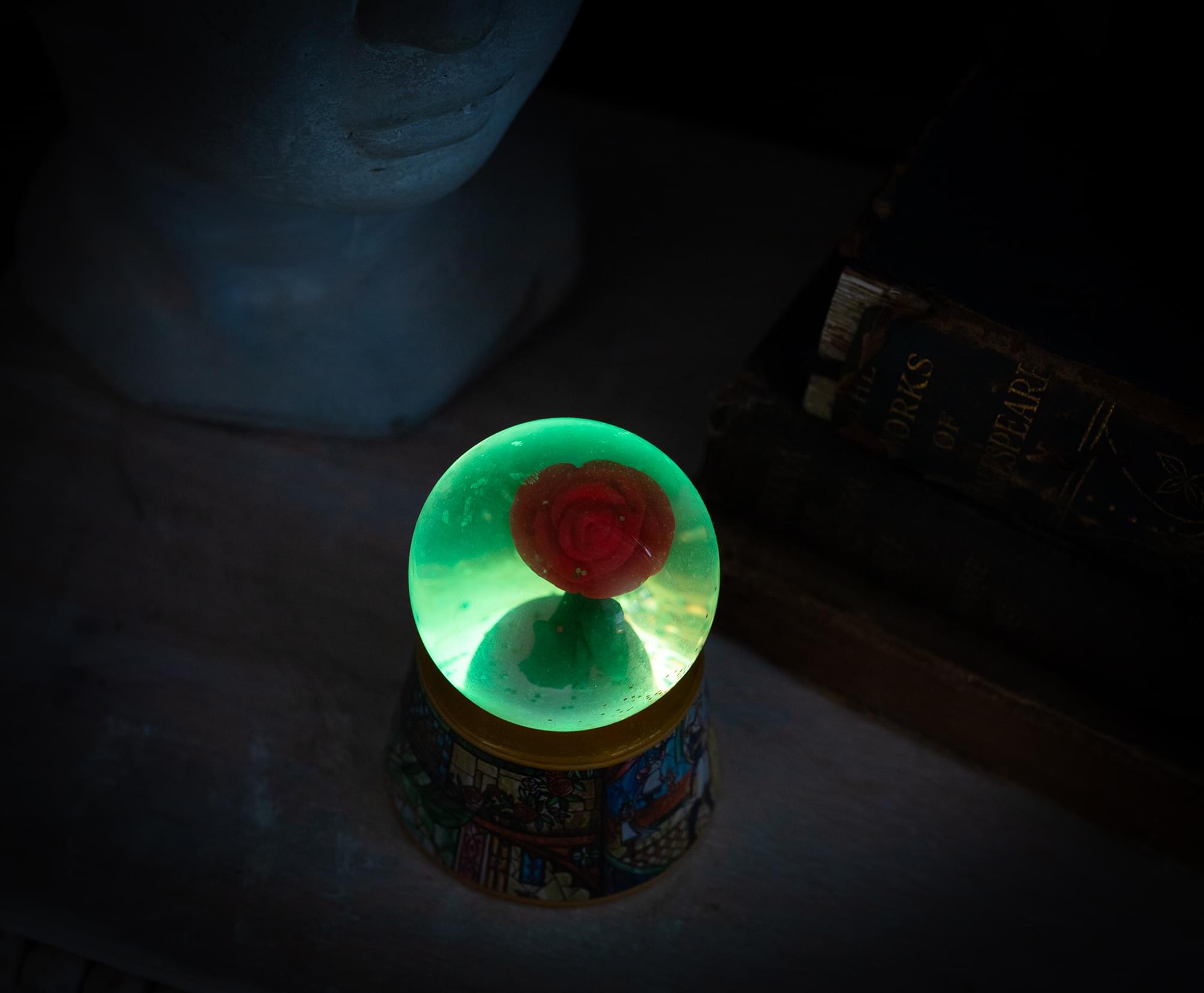 Bring the timeless romance home with this glittery snow globe. Just flick the switch on the bottom of the base to illuminate the Enchanted Rose in a magical glow.