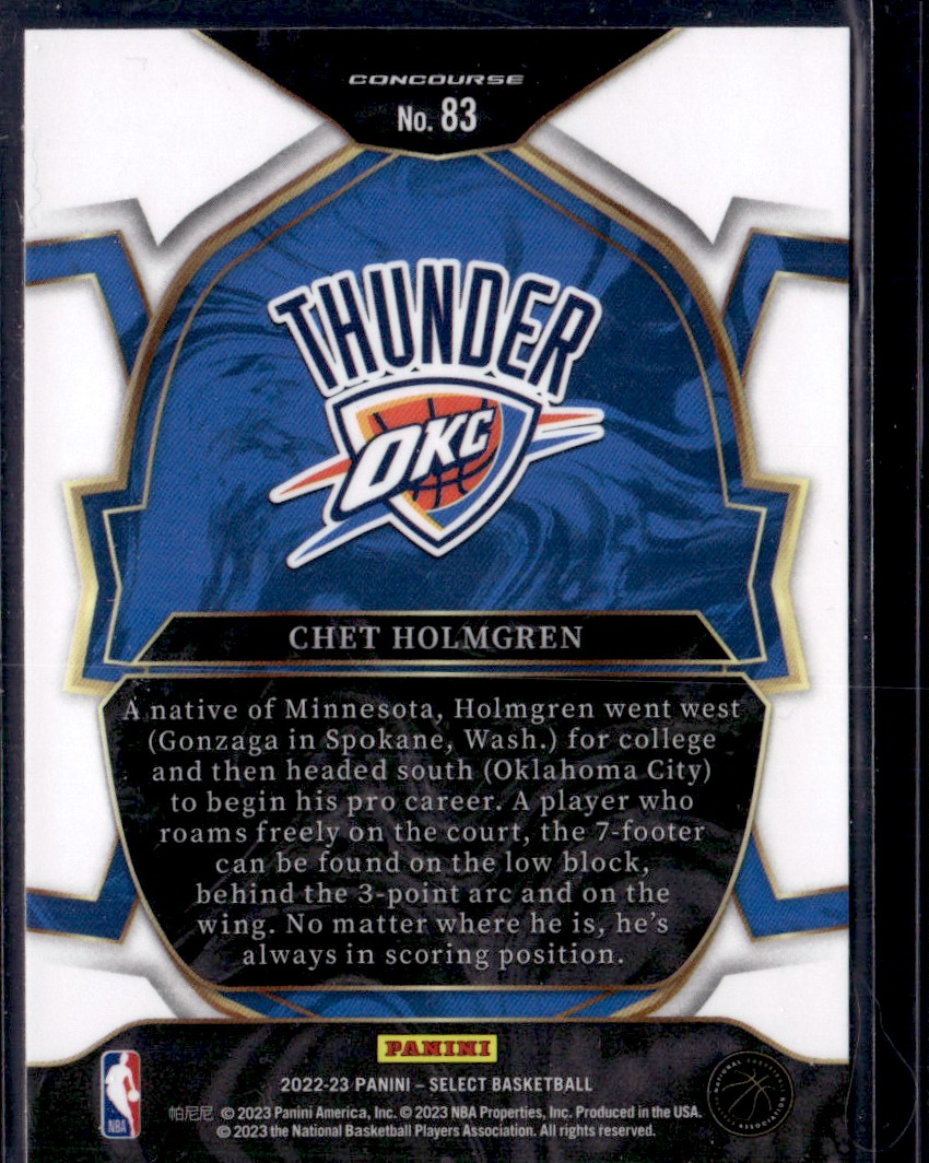 | CHET HOLMGREN 2022-23 PANINI SELECT CONCOURSE RC OKLAHOMA CITY THUNDER #83 | ||||||||||||||||||