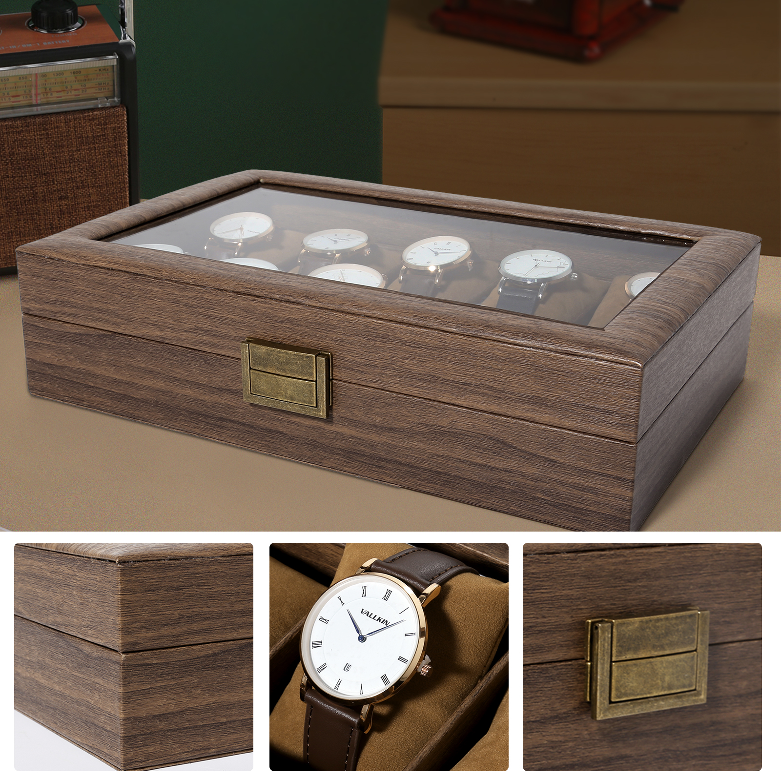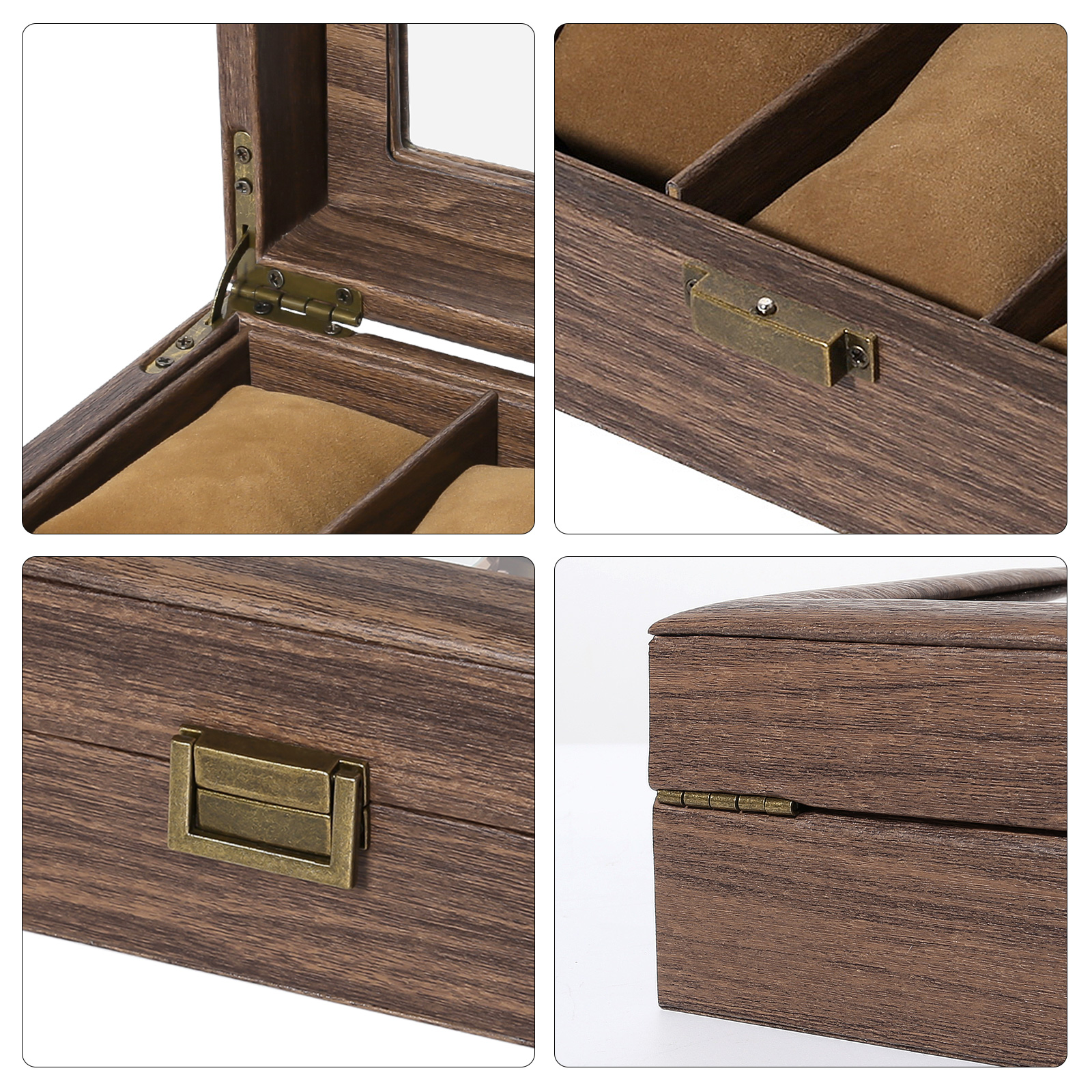 Premium Protection & Clarity High-Quality Construction: Built from durable wood (density board) with a luxurious wood grain veneer finish. Crystal Clear Viewing: Generous glass top beautifully showcases your watches while shielding them from dust. Plush Interior: Soft bead velvet lining cradles each watch, preventing scratches.
