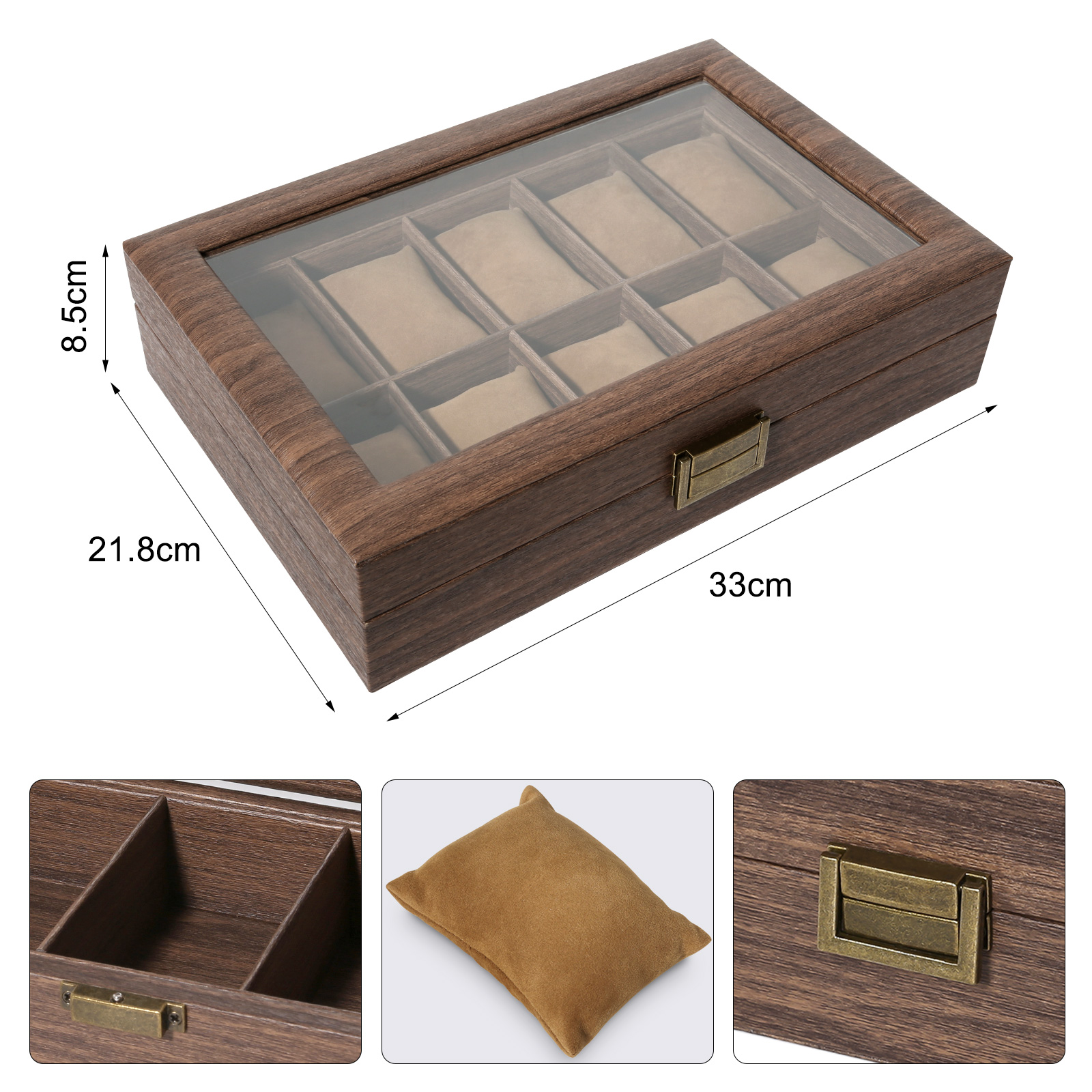 Specifications Material: Wood (Density Board) with Wood Grain Veneer Interior: Plush Bead Velvet Capacity: 10 Watches Dimensions: 33 x 21.8 x 8.5 cm (13" x 8.6" x 3.3") Weight: 1500g (3.3 lbs)