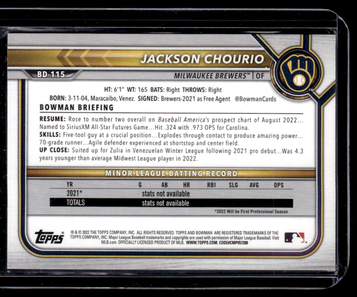 | JACKSON CHOURIO 2022 BOWMAN DRAFT RC MILWAUKEE BREWERS #BD-115 | ||||||||||||||||||