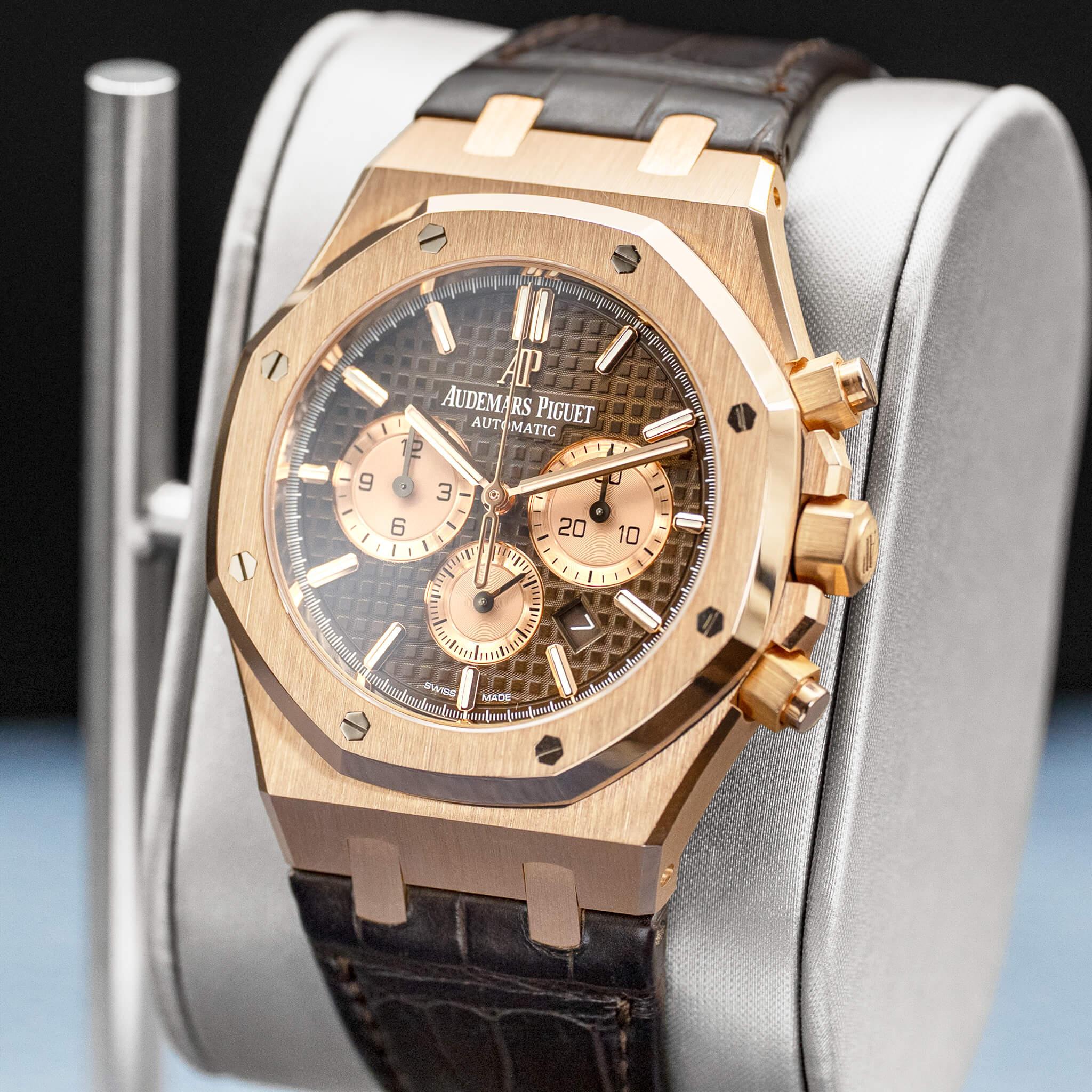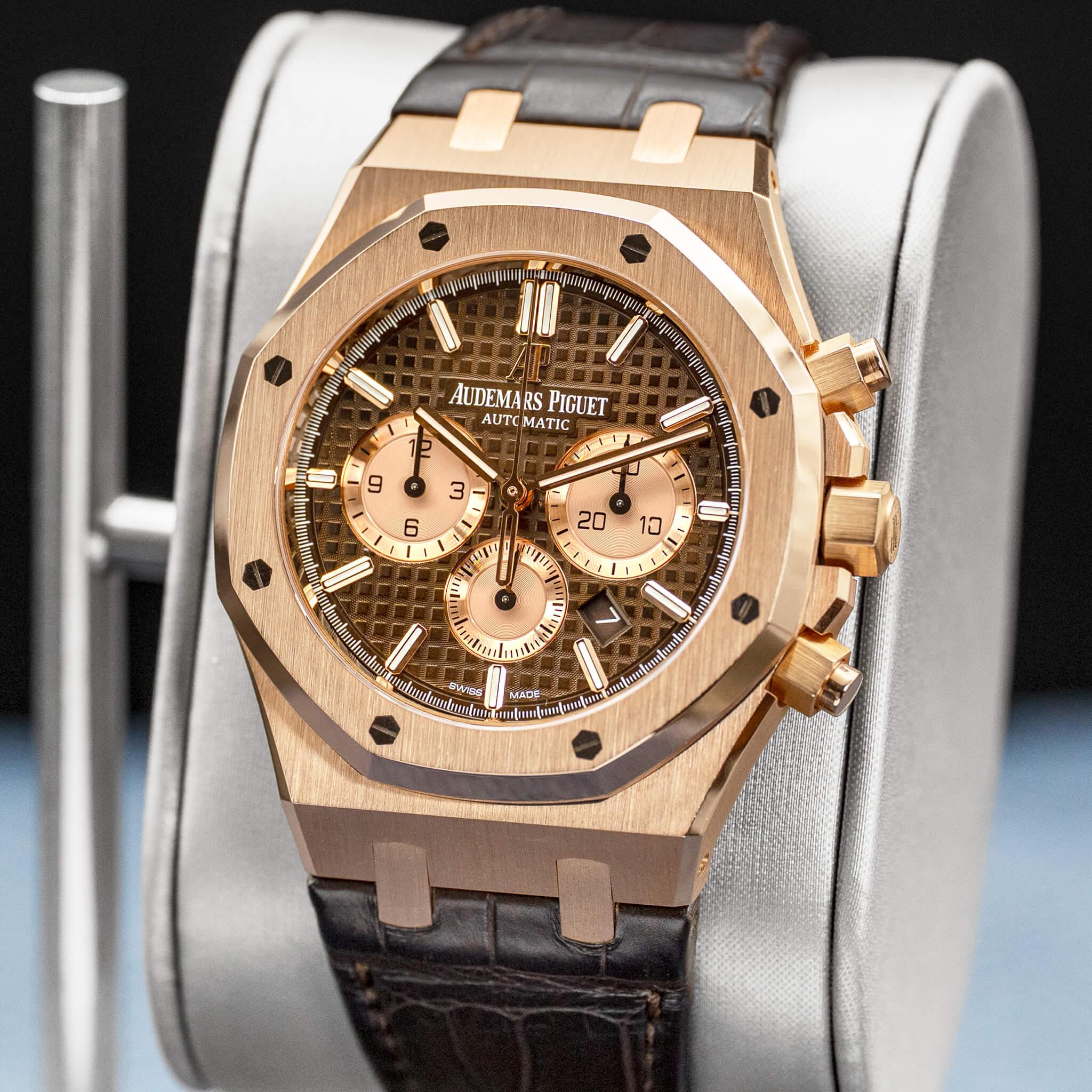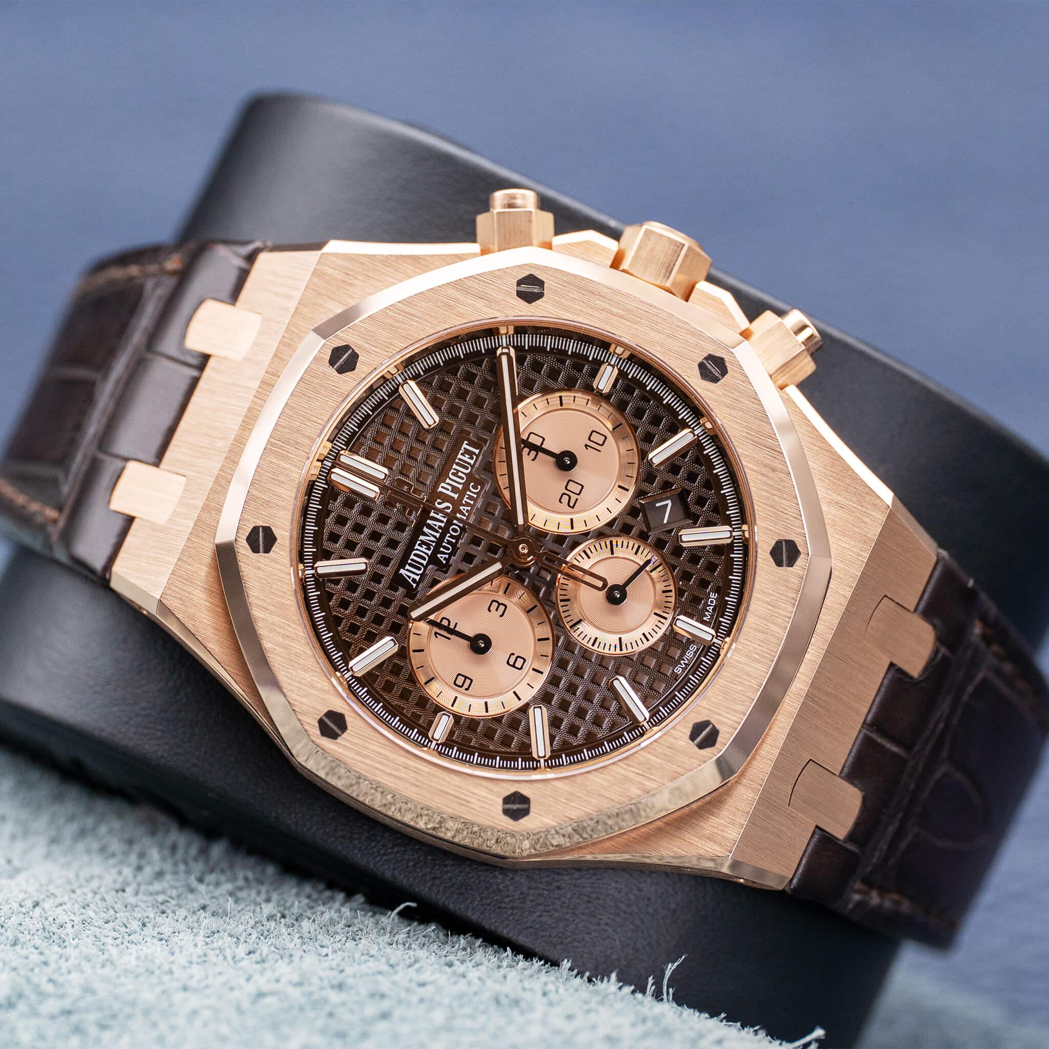 The Audemars Piguet Royal Oak Chronograph 26331OR in rose gold with the brown dial is a striking and luxurious execution of the iconic Royal Oak design. The 41mm 18k rose gold case showcases Gérald Genta’s legendary octagonal bezel, finished with a masterful combination of brushed surfaces and polished bevels that highlight AP’s exceptional craftsmanship. The rich brown “Grande Tapisserie” dial adds warmth and depth, beautifully complementing the rose gold case while maintaining crisp legibility across the chronograph subdials. Powered by Audemars Piguet’s in-house Calibre 2385 automatic chronograph movement, this reference combines refined performance with unmistakable presence, making it a standout piece within the Royal Oak collection.