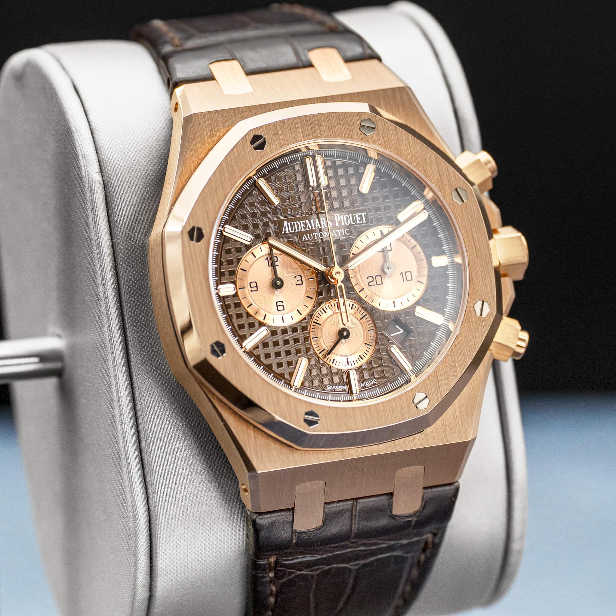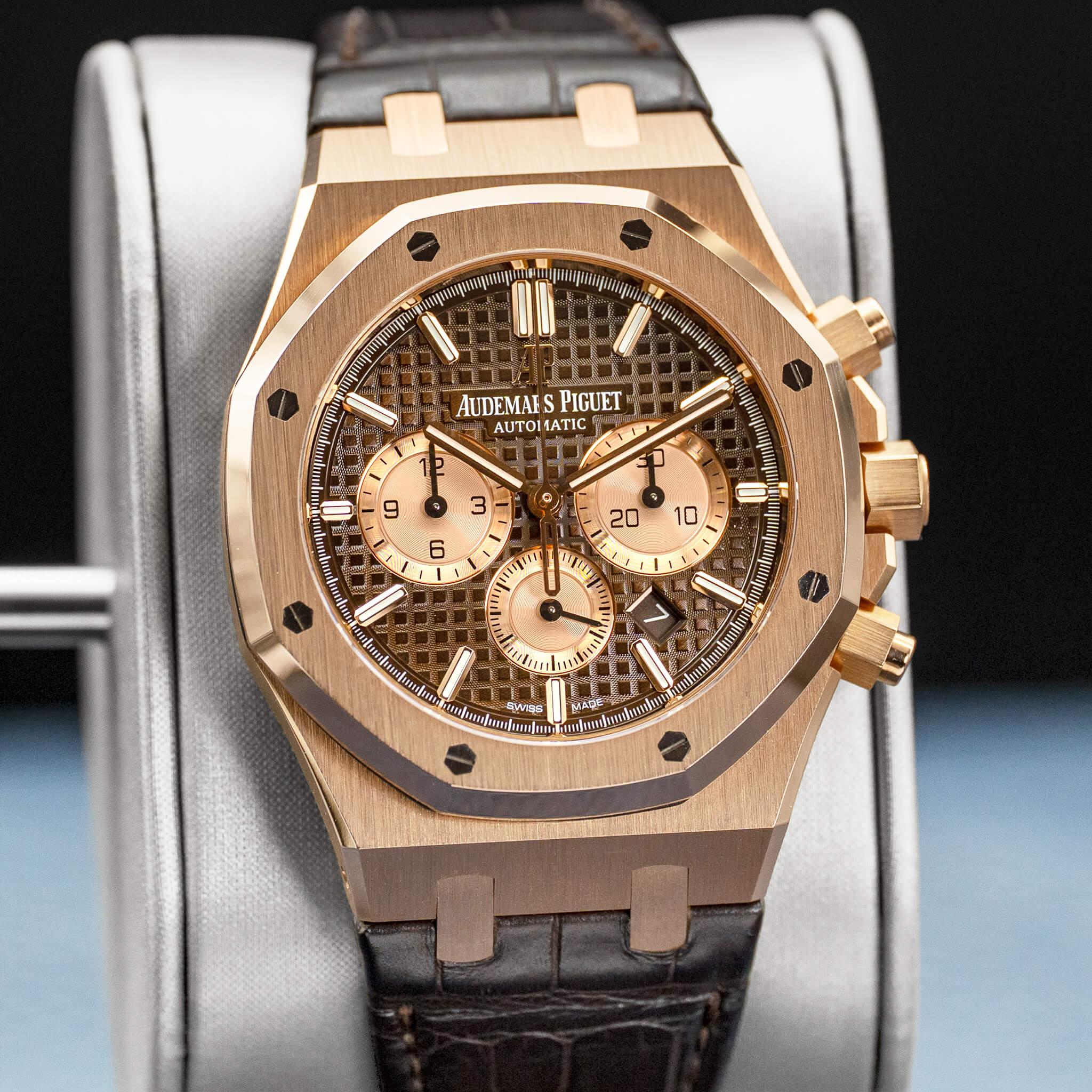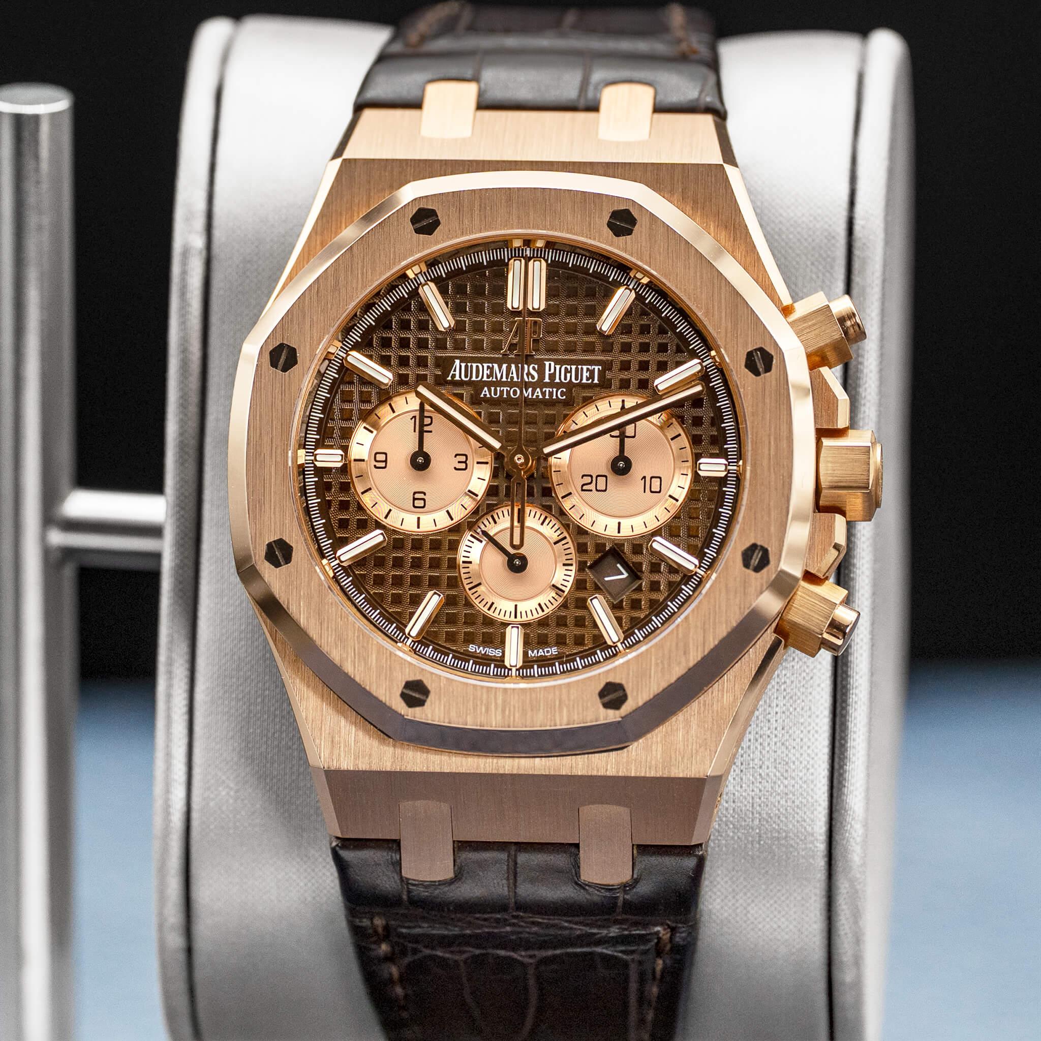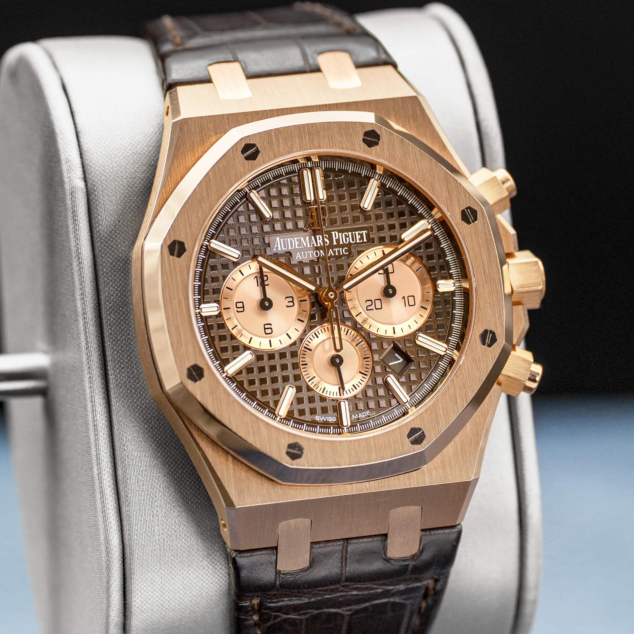 The Audemars Piguet Royal Oak Chronograph 26331OR in rose gold with the brown dial is a striking and luxurious execution of the iconic Royal Oak design. The 41mm 18k rose gold case showcases Gérald Genta’s legendary octagonal bezel, finished with a masterful combination of brushed surfaces and polished bevels that highlight AP’s exceptional craftsmanship. The rich brown “Grande Tapisserie” dial adds warmth and depth, beautifully complementing the rose gold case while maintaining crisp legibility across the chronograph subdials. Powered by Audemars Piguet’s in-house Calibre 2385 automatic chronograph movement, this reference combines refined performance with unmistakable presence, making it a standout piece within the Royal Oak collection.