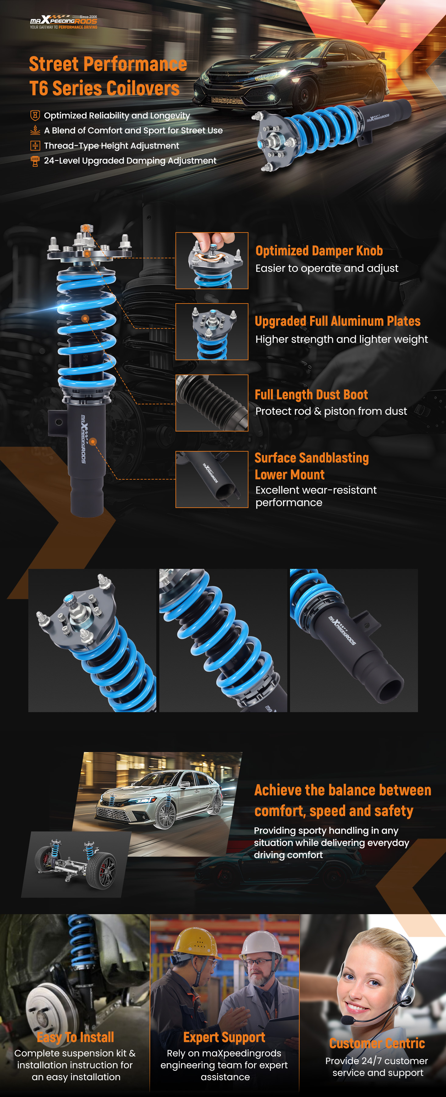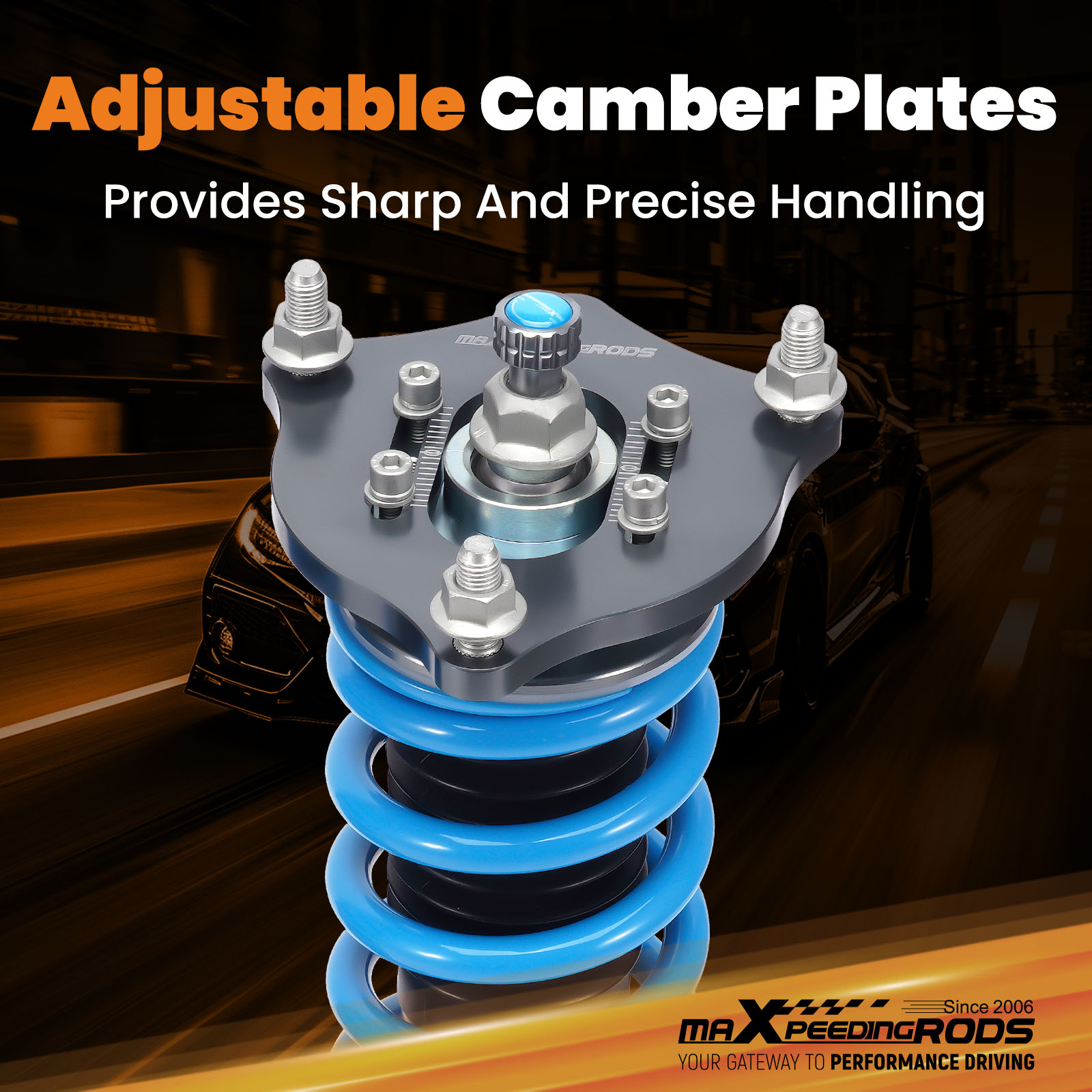4. 24 Clicks of Rebound Adjustments -- This allows you the ability to perfectly dial in your coilovers system. For a nice comfortable driving, set damping to full soft. For more spirited driving, set it to 16 clicks. For occasional track days, set it to full stiff.