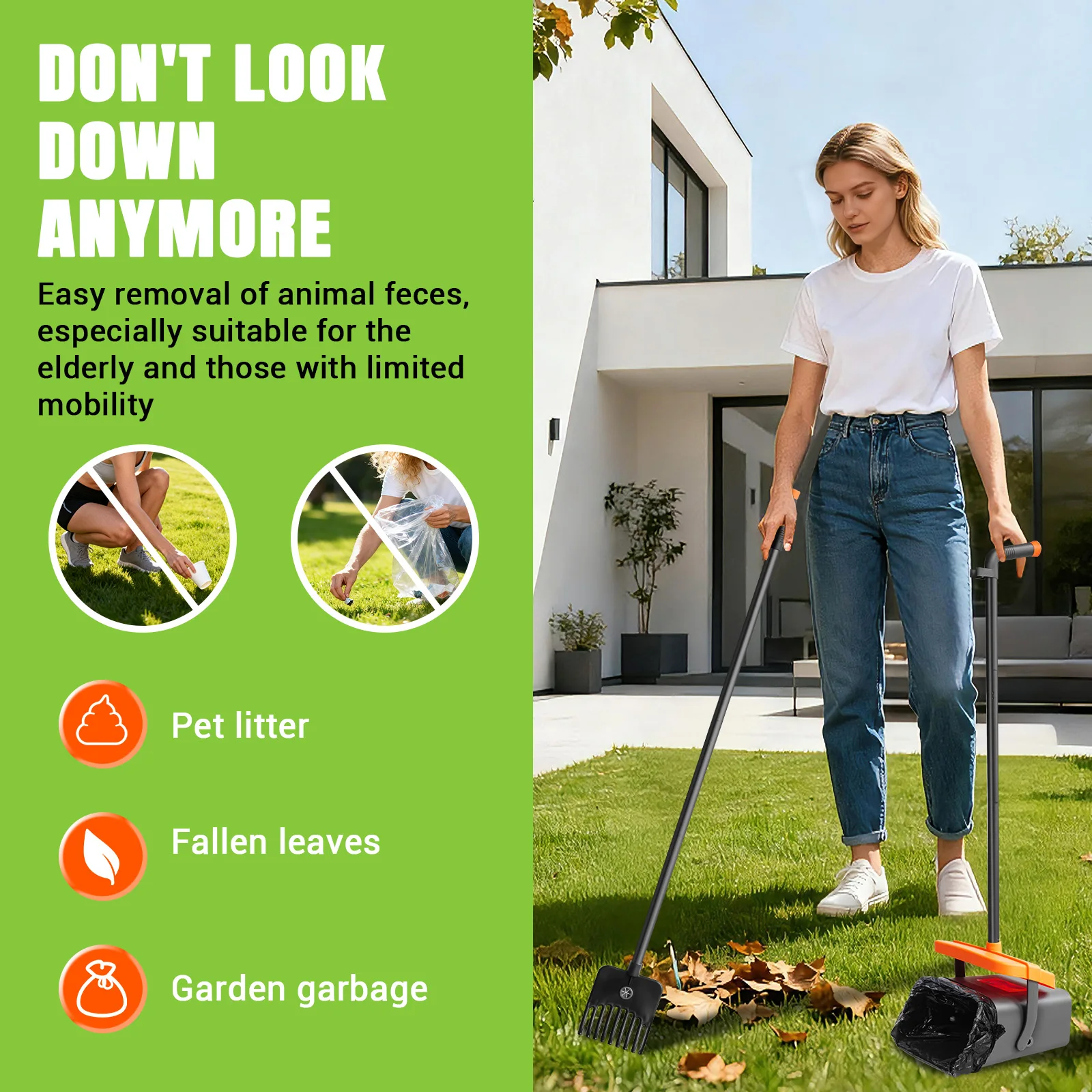 【Convenient Poop Scooping】: Equipped with an adjustable 117 cm long stainless steel handle, this chicken poop scoop & rake effectively eliminates the inconvenience of bending over and makes cleaning up after your pet easier and less tiring when walking dogs outdoors.