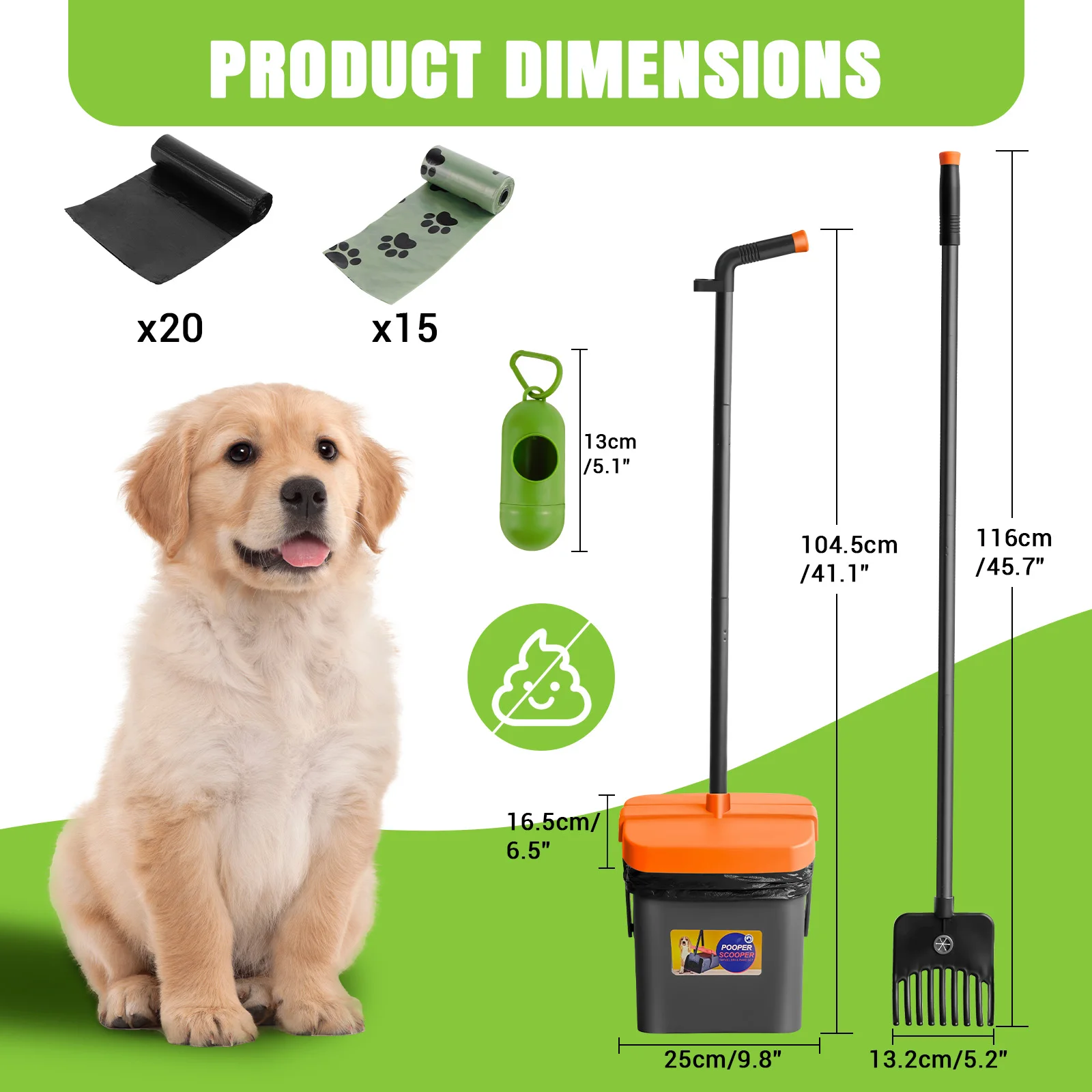 【Wide Range of Applications】: This large-capacity rotating bin with rake is specially designed for large dogs and households with multiple pets to efficiently remove pet waste. In addition, it is also suitable for removing garden debris such as leaves and pine cones and can be used on lawns, gravel paths, dirt areas and more.