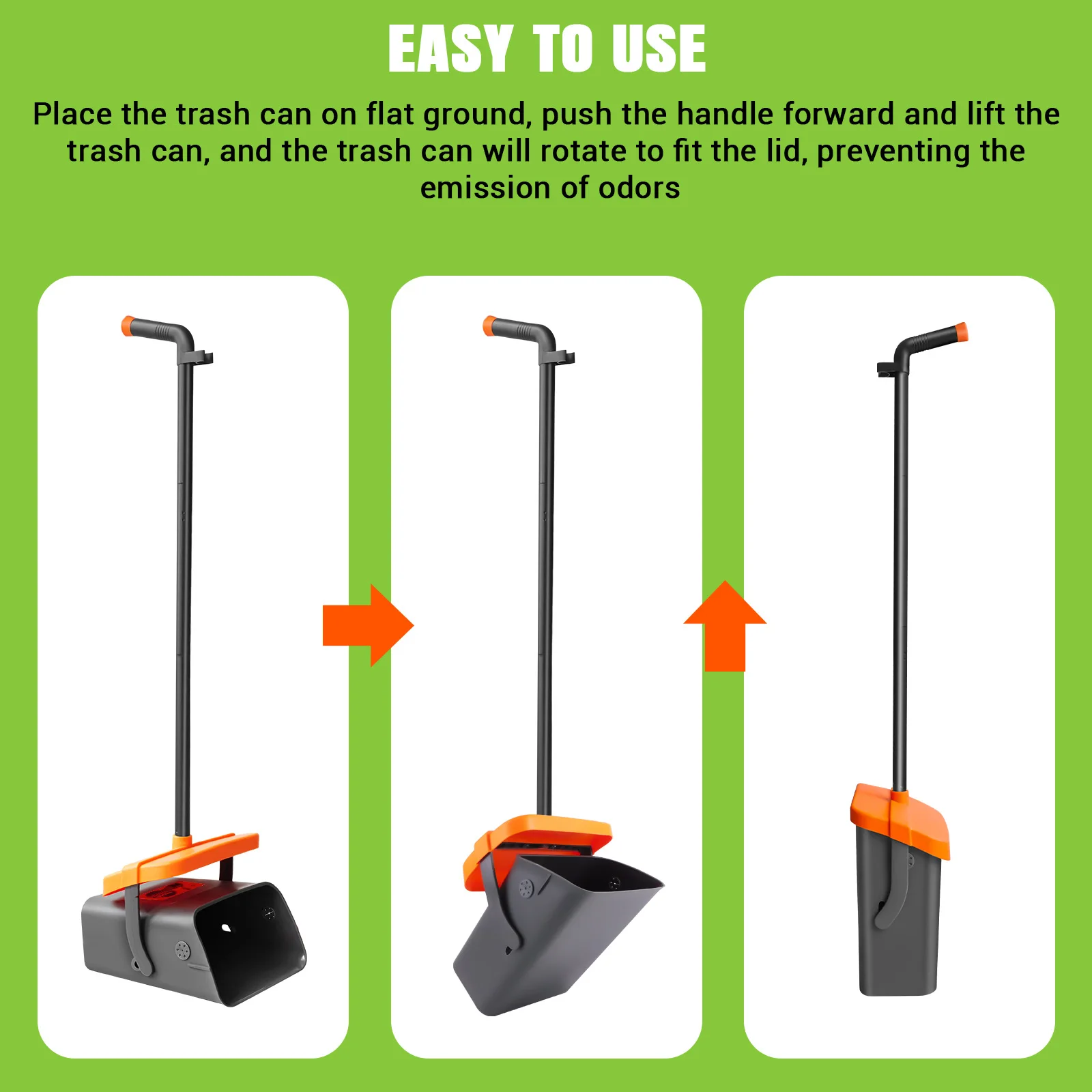 【Odor Reduction】: When you place the trash can on a flat surface, push the handle forward, and lift the trash can, the lid of the trash can closes automatically, effectively preventing odors, keeping out rainwater and insects, and keeping the environment fresh and pleasant.