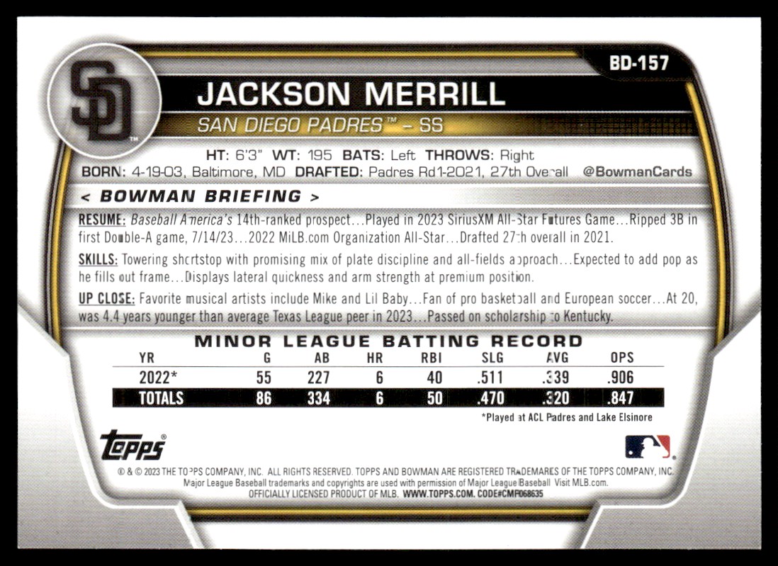 | JACKSON MERRILL 2023 BOWMAN DRAFT RC SAN DIEGO PADRES #BD-157 | ||||||||||||||||||
