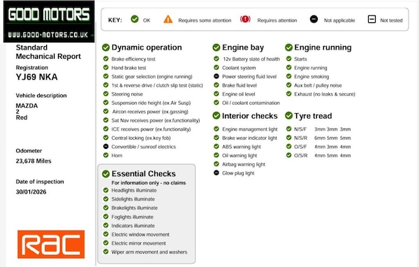 +++ YOU CAN BUY ANY CAR WITH A PART PAYMENT OF JUST £500 THE CAR MUST BE COLLECTED/PAID IN FULL WITHIN 7 DAYS +++ +++SAME DAY NATIONWIDE DELIVERY AVAILABLE+++ +++OVER 150 VEHICLES IN STOCK+++ +++FINANCE AVAILABLE+++HERE WE HAVE ANOTHER CAREFULLY SELECTED PART EXCHANGE VEHICLE, A VERY NICE EXAMPLE, COMES WITH WARRANTY, ONE OWNER FROM NEW 0 FORMER KEEPERS, COMES WITH MOT TILL OCTOBER 2026, THE VEHICLE IS IN GOOD CONDITION BOTH INSIDE AND OUT. NON-SMOKER OR PET OWNER CAR, SUPERB SPEC INCLUDING: FULL MAP SAT NAV, COLOUR SCREEN DISPLAY, DAB RADIO, BLUETOOTH HANDS FREE, AUDIO STREAMING, USB AND AUXILIARY INPUT SOCKET, CLIMATE CONTROL. KEY LESS START, CRUISE CONTROL, SPEED LIMITER, DAY TIME RUNNING LIGHTS. REAR LED LIGHTS. AUTO LIGHTS. AUTO WIPERS. ELECTRIC WINDOWS, ELECTRIC POWER FOLDING MIRRORS, CENTRAL LOCKING, AIR CONDITIONING, PARKING SENSORS, TYRE PRESSURE MONITORING SYSTEM. ISOFIX & CHILD LOCKS. MULTI FUNCTION STEERING WHEEL CONTROLS. PRIVACY GLASS. ALLOYS, SUPPLIED WITH 2 REMOTE KEYS. 35 POINT HEALTH CHECK WITH 20 MILE TEST DRIVE, HPI CLEAR WITH AND VOSA MILEAGE REPORT, EXTENDED RAC WARRANTIES WITH BREAKDOWN COVER AVAILABLE, ALL BANK TRANSFERS WELCOME, VIEW OVER 150 SIMILAR CARS ON OUR WEBSITE +++ EVERY EFFORT HAS BEEN MADE TO ENSURE THE ACCURACY OF THE INFORMATION ABOVE. HOWEVER, ERRORS MAY OCCUR. CHECK WITH A SALESPERSON ABOUT ITEMS WHICH MAY AFFECT YOUR DECISION TO PURCHASE. .15in Alloy Wheels, 7in Colour Touch Screen Display, ABS - Anti Lock Braking System, AM-FM DAB Radio - Single CD Player-MP3 A, AUX and 2 USB Inputs, 15in Alloy Wheels, 7in Colour Touch Screen Display, ABS - Anti Lock Braking System, AM-FM DAB Radio - Single CD Player-MP3 Audio System with 4 Speakers, AUX and 2 USB Inputs, Air Conditioning - Climate Control, Analogue Speedometer, Courtesy Light with Integrated Spotlight, Cruise Control with Adjustable Speed Limiter, Dashboard Panel - Black Gloss, Door Mirrors - Electrically Adjustable - Heated - Power Folding with Integrated Indicator Lights, Door Pockets - Driver and Front Passenger, Dual Front Airbags, Dusk Sensing Automatic Headlights, Dynamic Stability Control - DSC - with Traction Control System - TCS, Electric Windows - Front and Rear with One Touch Auto Up and Down on Drivers Side, Electronic Power Assisted Steering, Emergency Stop Signalling System - ESS, Engine Start-Stop Button, Front Fog Lights - LED, Front Passenger Airbag Cut-Off Switch, Front Passenger Seat - Manual Height Adjustment, Front Passengers Seat - Manual Slide and Recline Adjustment, Front Side Airbags, Front and Rear Curtain Airbags, G-Vectoring, Gear Knob - Leather, Gear Shift Indicator, Glovebox, Grab Handles - Front Passenger and Two Rear with Coat Hooks, Halogen Daytime Running Lights, Handbrake - Leather Wrapped, Headlights - Coming-Leaving Home, Headlights - Halogen with Manual Headlight Levelling, Hill Hold Assist, ISOFIX Child Seat Anchorage - Attached to Outer Rear Seats, Integrated Bluetooth System, Lane Departure Warning System, Luggage Compartment - Light, MZD-Connect, Multimedia Commander, Rain-Sensing Front Wipers, Rear Parking Sensors, Remote Central Locking with Deadlocking, SRS - Supplementary Restraint System, Satellite Navigation System, Seatback Pocket - Front Passenger, Seatbelt - Reminder Screen - Driver - Passenger and Rear Seats with Audible Warning, Seatbelts - Front - 3 Point - ELR x 2 with Pre-Tensioners, Seatbelts - Rear - 3-point - ELR x 2 with Pre-tensioners, Seats - 60-40 Split Folding Rear, Seats - Drivers Manual Slide-Recline and Height Adjustment, Self-Supporting Rigid and Torsion-Resistant All-Steel Body with Defined Crush Zones for the Front and Rear Sections - Stable Passenger Safety Cell with Side Impact Reinforcement in the Doors, Smart City Brake Support, Steering Wheel - Leather, Steering Wheel - Mounted Remote Audio Controls, Steering Wheel - Telescopic and Tilt Adjust, Sunvisors - Drivers a