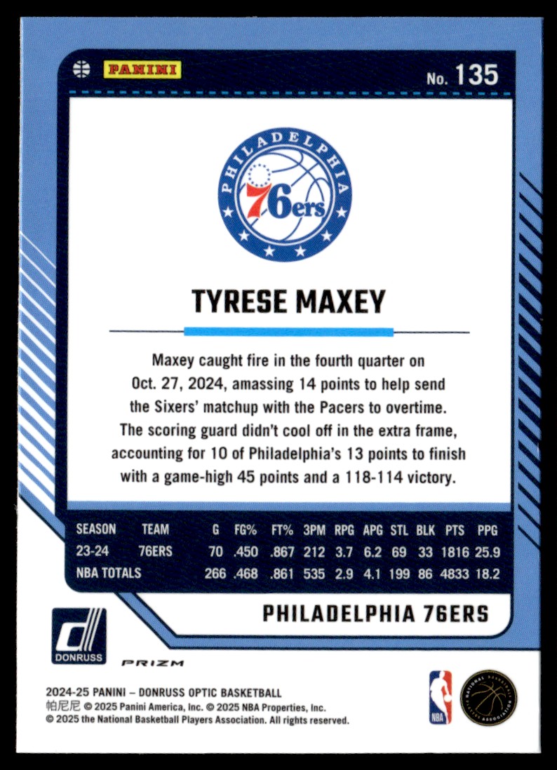 | TYRESE MAXEY 2024-25 DONRUSS OPTIC PURPLE SHOCK PHILADELPHIA 76ERS #135 | ||||||||||||||||